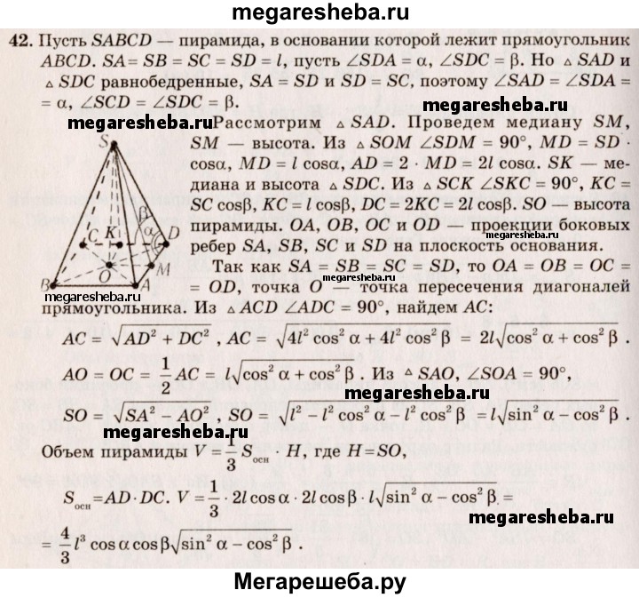 42. В основании пирамиды лежит прямоугольник. Каждое боковое ребро пирамиды равно I и составляет со смежными сторонами прямоугольника углы α и β. Найдите объем пирамиды.