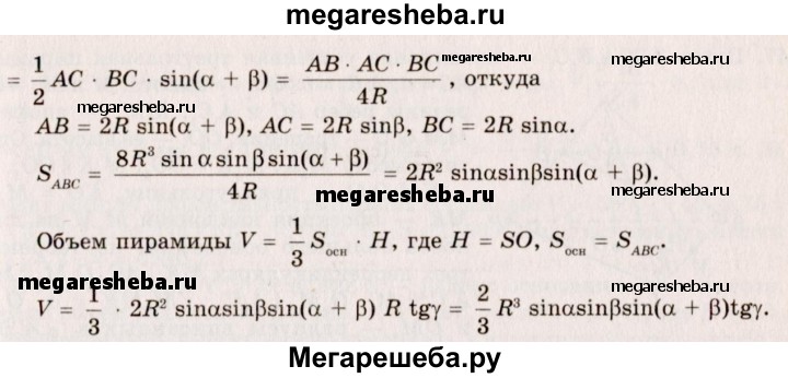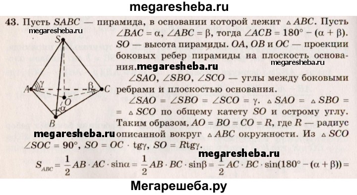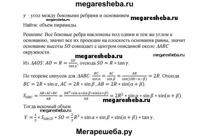 43. Найдите объем пирамиды, имеющей основанием треугольник, два угла которого α и β, радиус описанного круга R. Боковые ребра пирамиды наклонены к плоскости ее основания под углом ϒ.