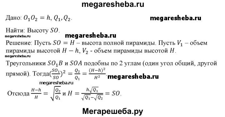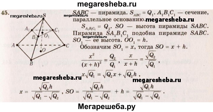45. В пирамиде с площадью основания проведено сечение, параллельное основанию, на расстоянии h от него. Площадь сечения равна Q2. Найдите высоту пирамиды.