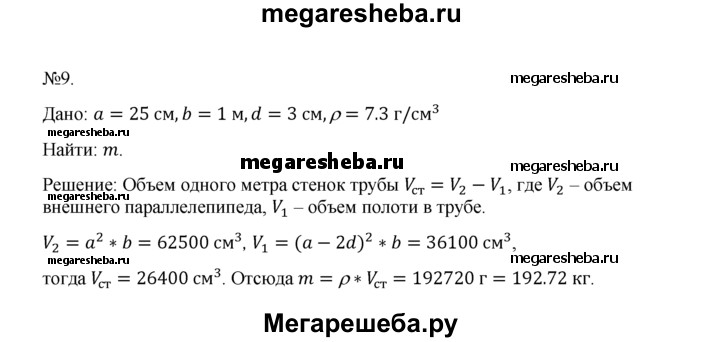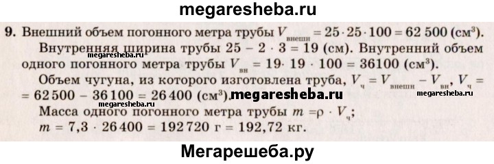 9. Чугунная труба имеет квадратное сечение, ее внешняя ширина 25 см, толщина стенок 3 см. Какова масса одного погонного метра трубы (плотность чугуна 7,3 г/см3)?