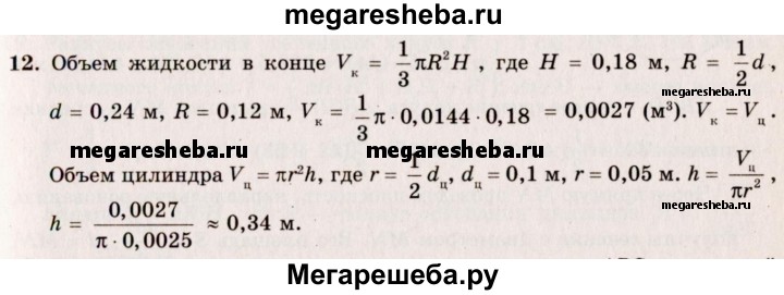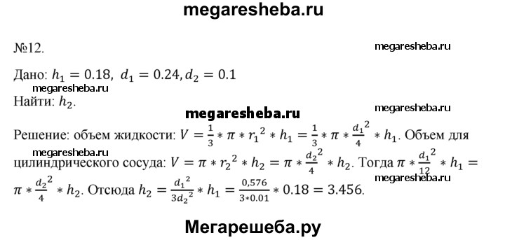 12. Жидкость, налитая в конический сосуд высотой 0,18 м и диаметром основания 0,24 м, переливается в цилиндрический сосуд, диаметр основания которого 0,1 м. Как высоко будет стоять уровень жидкости в сосуде?