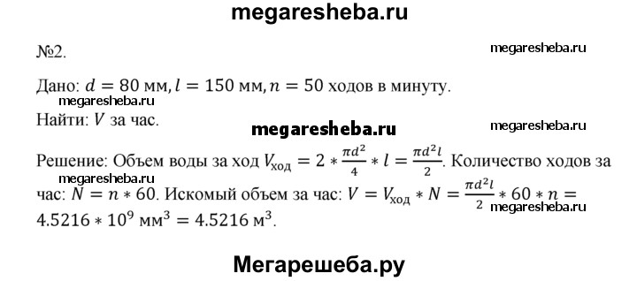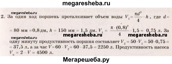 2. Насос, подающий воду в паровой котел, имеет два водяных цилиндра. Диаметры цилиндров 80 мм, а ход поршня 150 мм. Чему равна часовая производительность насоса, если каждый поршень делает 50 рабочих ходов в минуту?