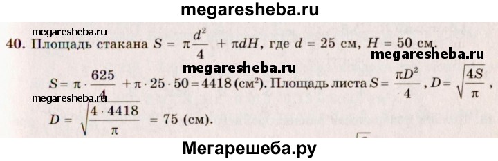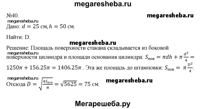 40. Из круглого листа металла выштампован цилиндрический стакан диаметром 25 см и высотой 50 см. Предполагая, что площадь листа при штамповке не изменилась, найдите диаметр листа.
