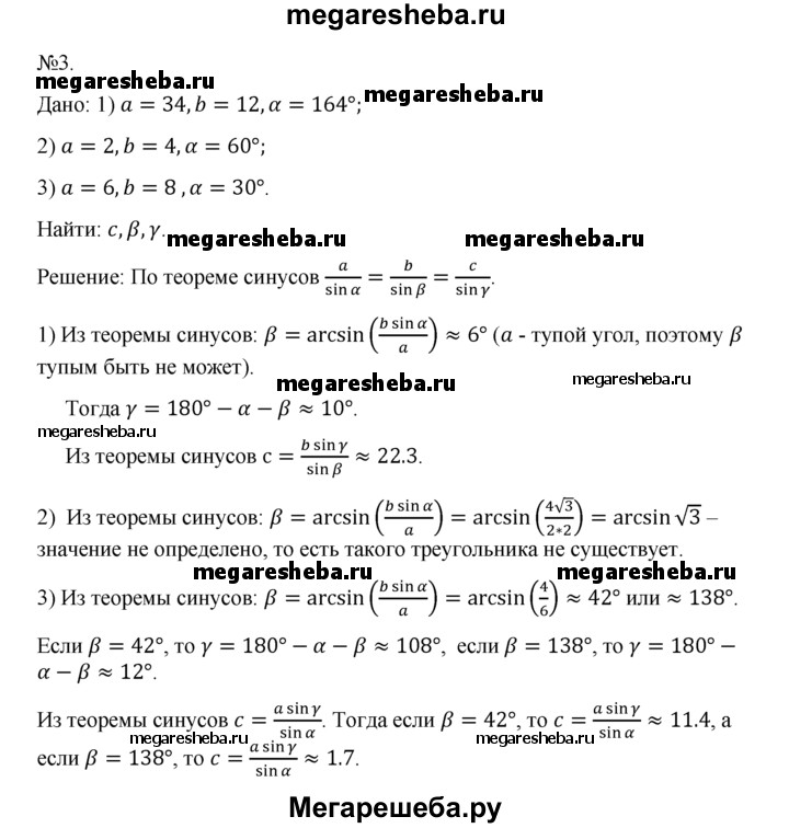 3. В треугольнике заданы две стороны и угол, противолежащий одной из них. Найдите остальные углы и сторону треугольника, если: 1) а = 34, b = 12, а = 164°; 2) а = 2, b = 4, α = 60°; 3) a = 6, Ь = 8, а = 30°.