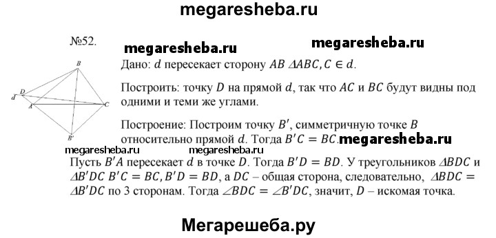 52. Дан треугольник ABC и прямая d, проходящая через вершину С и пересекающая сторону АВ. Найдите на прямой d точку D, из которой стороны АС и ВС треугольника видны под равными углами.