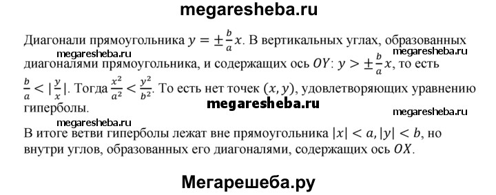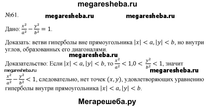 61. Докажите, что ветви гиперболы х2 / а2 – у2 / b2 = 1 расположены вне прямоугольника |х| < а, |у| < Ь, но внутри вертикальных углов, образованных прямыми, содержащими его диагонали.