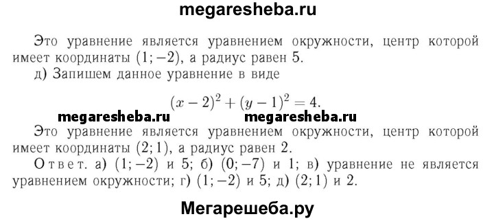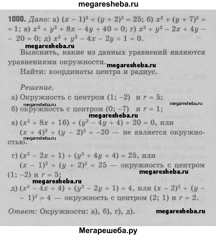 1000 Выясните, какие из данных уравнений являются уравнениями окружности. Найдите координаты центра и радиус каждой окружности: а) (х - 1)2 + (y + 2)2 = 25; б) х2 + (у+ 7)2 = 1; в) х2 + у2 + 8х - 4у + 40 = 0; г) х2 + у2 - 2х + 4у - 20 = 0; д) х2 + у2-4х-2у + 1 = 0.
