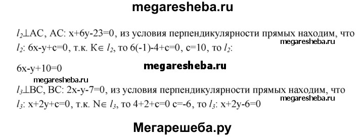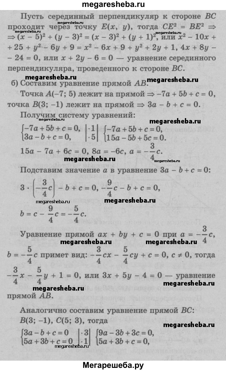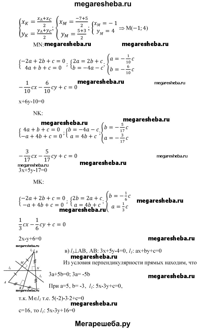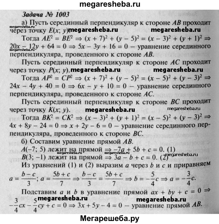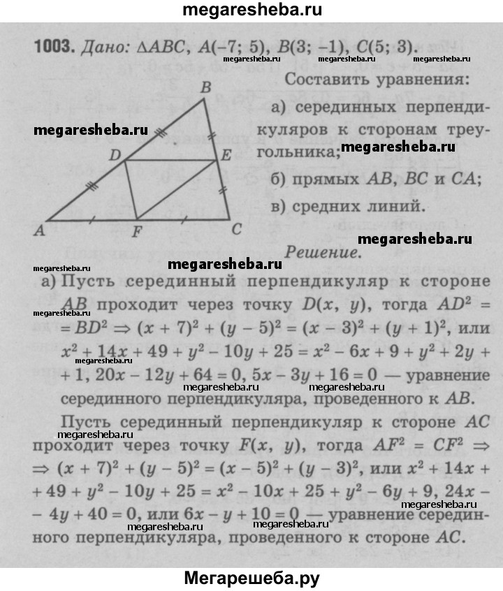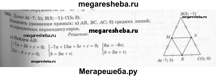 1003 Вершины треугольника ABC имеют координаты А (-7; 5), В (3; -1), С (5; 3). Составьте уравнения: а) серединных перпендикуляров к сторонам треугольника; б) прямых АВ, ВС и СА; в) прямых, на которых лежат средние линии треугольника.