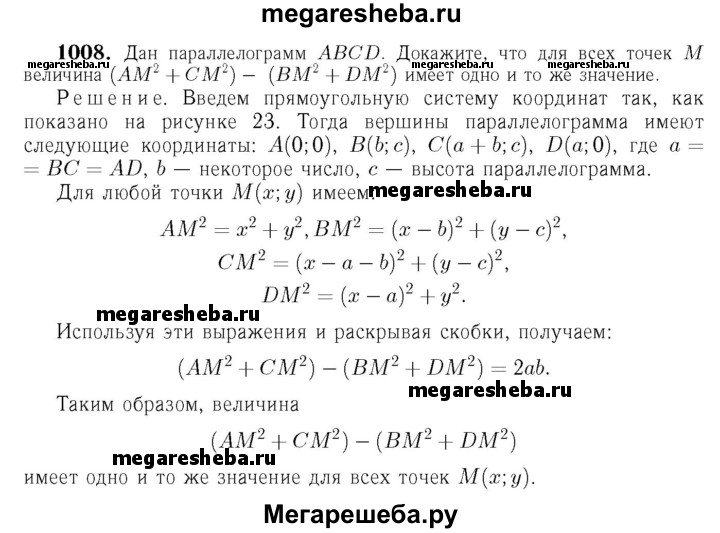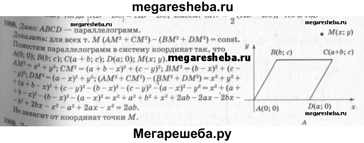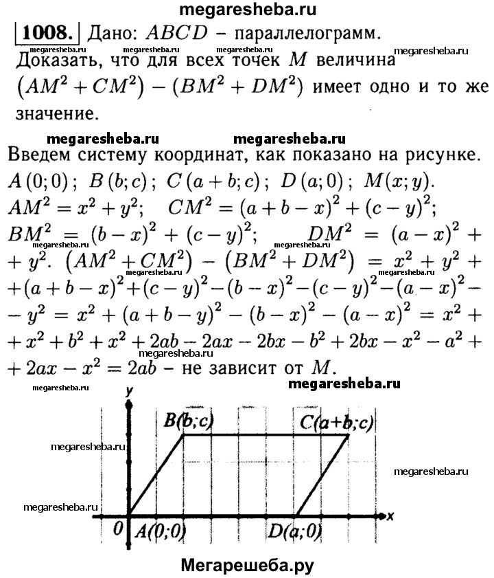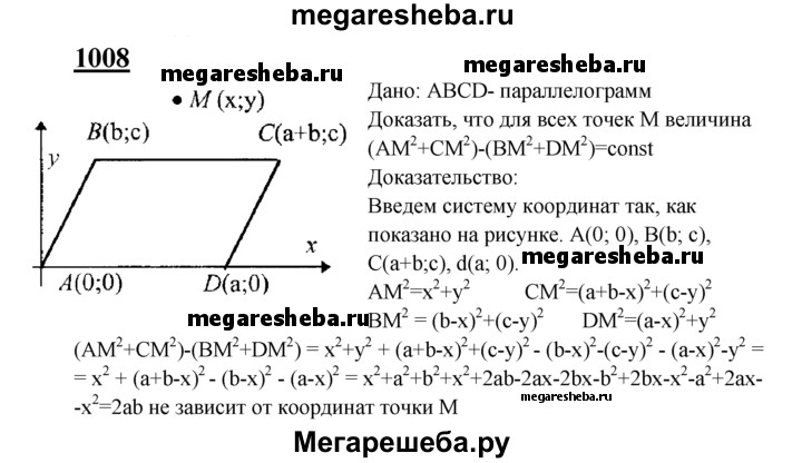 1008 Дан параллелограмм ABCD. Докажите, что для всех точек М величина (AM2 + СМ2) - (ВМ2 + DM2) имеет одно и то же значение.