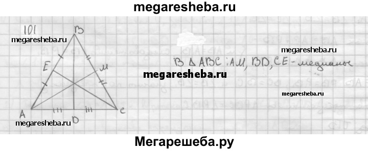 101 Начертите треугольник. С помощью масштабной линейки отметьте середины сторон и проведите медианы треугольника.
