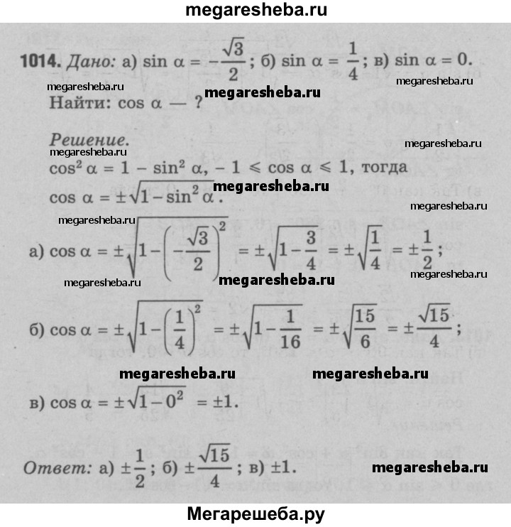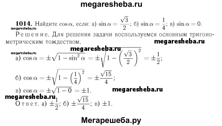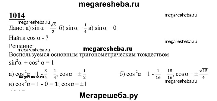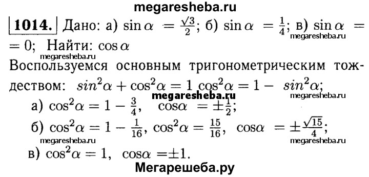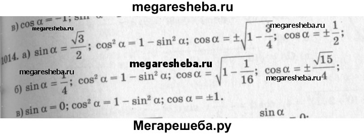 1014 Найдите cos а, если: а) sin a = √3/2; б) sin a = ¼ в)sin a = 0