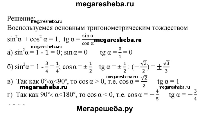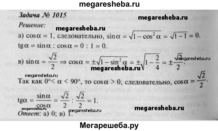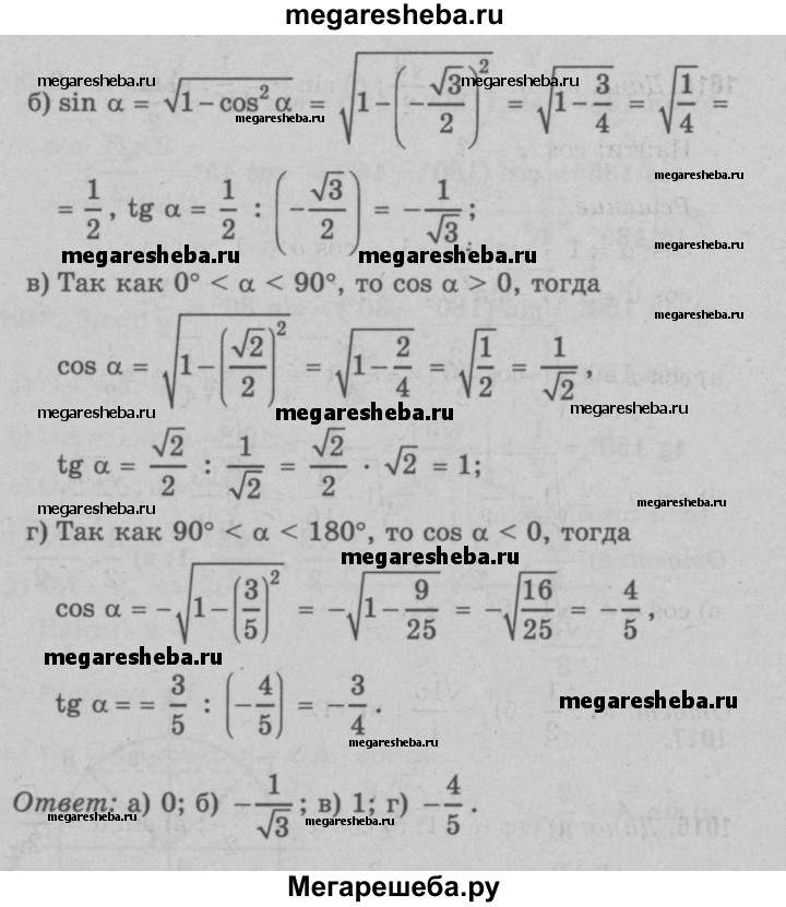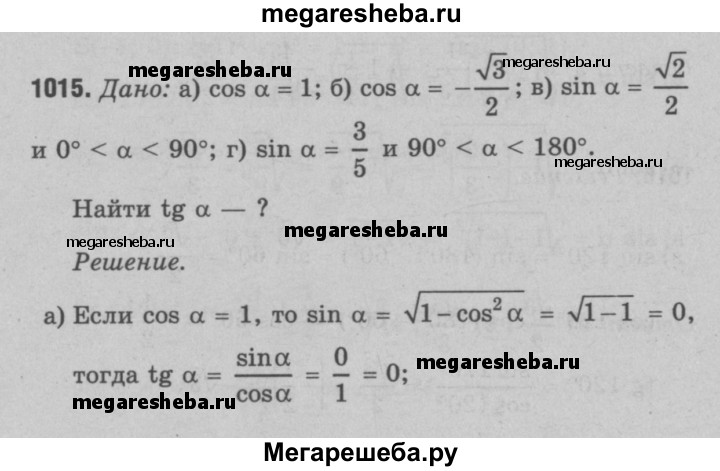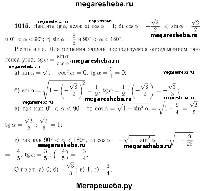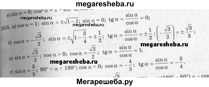 1015 Найдите tg a, если: a) cos a = 1; б) cos a = — √3.2; в) sin a = √2.2 0°< a < 90°; r) sin a = 3/5 и 90° < a < 180°. 5