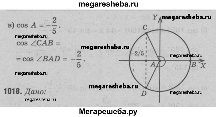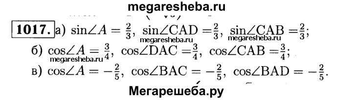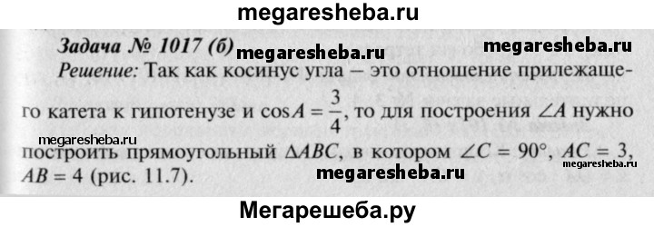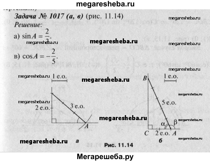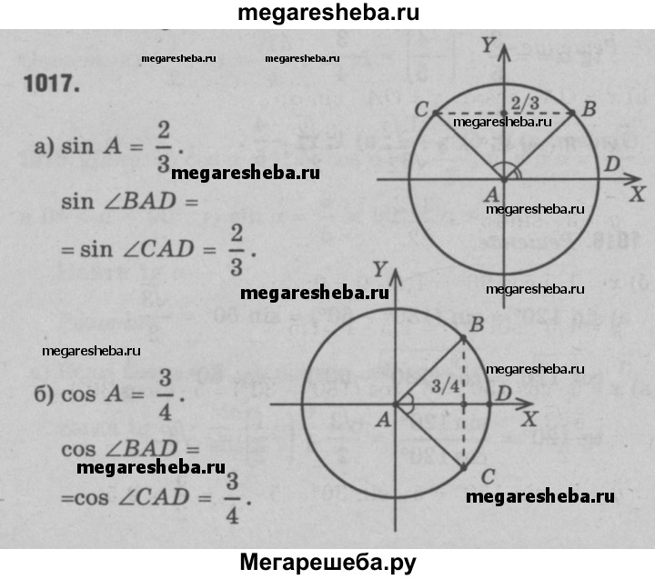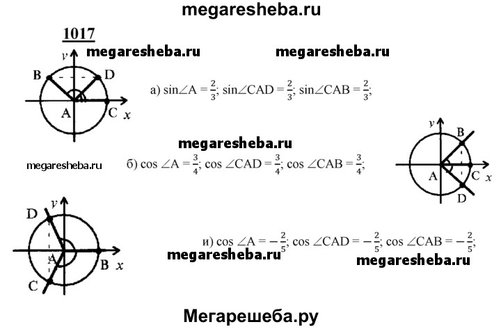 1017 Постройте ∠A, если: а) sin А = 2/3; б) cos А = 3/4; в) cosA = - 2/5.