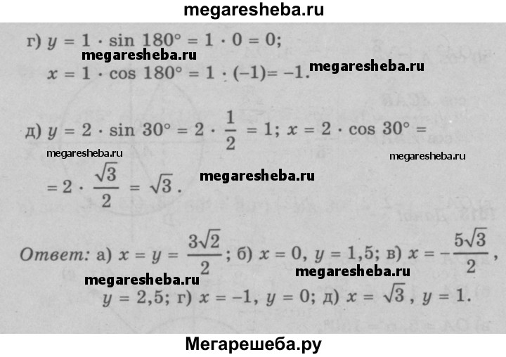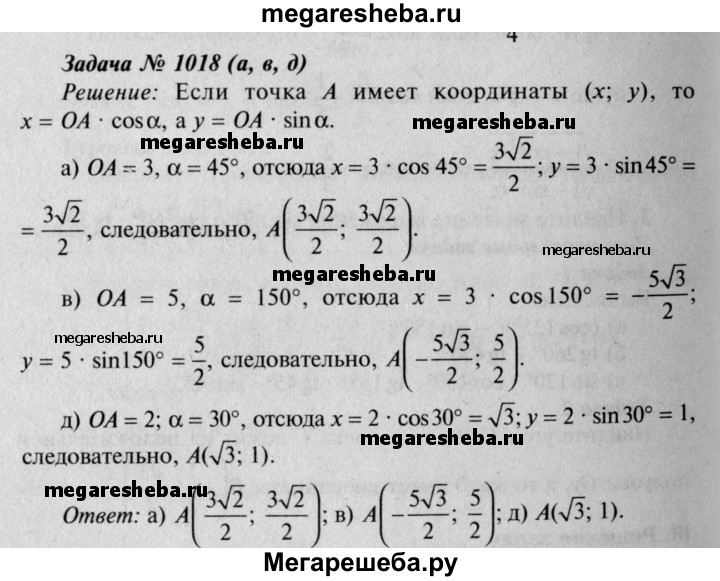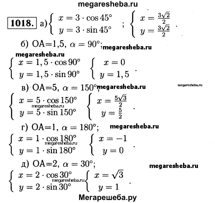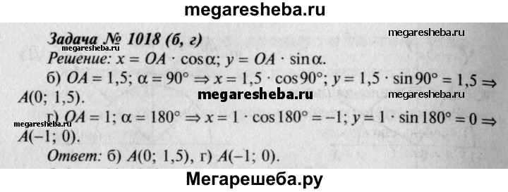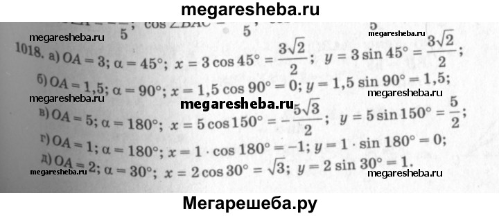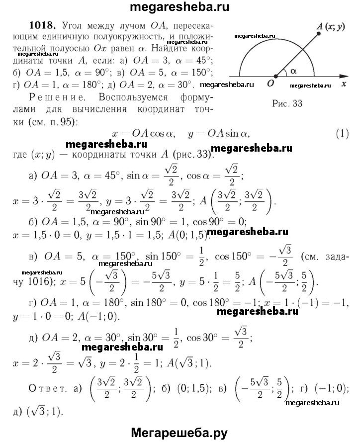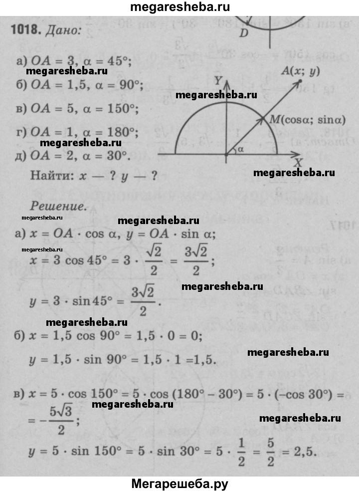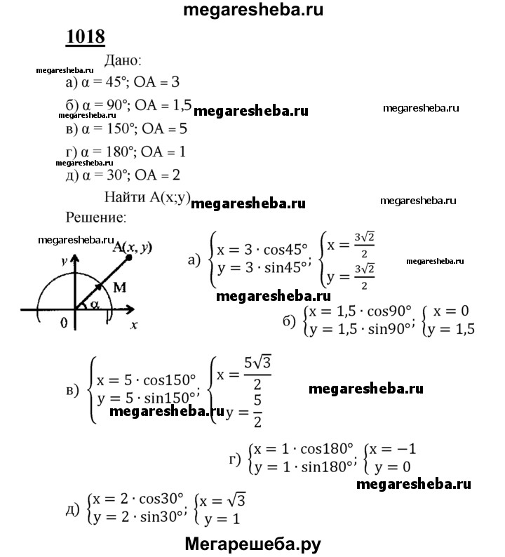 1018 й Угол между лучом OA, пересекающим единичную полуокружность, и положительной полуосью Ох равен а. Найдите координаты точки А, если: а) OA = 3, a = 45°; б) ОА = 1,5, а = 90°; в) ОА = 5, а=150°; г) OA = 1, а =180°; д) OA = 2, а = 30°.