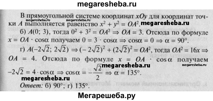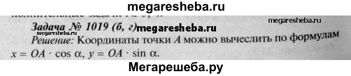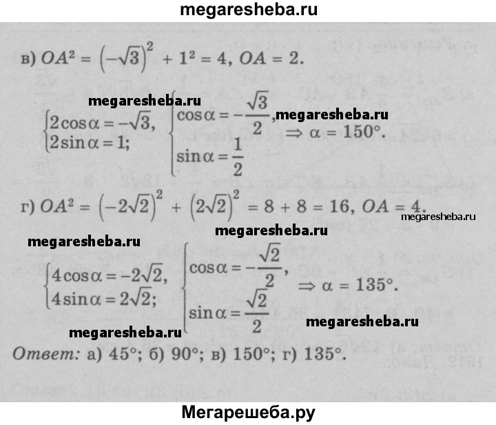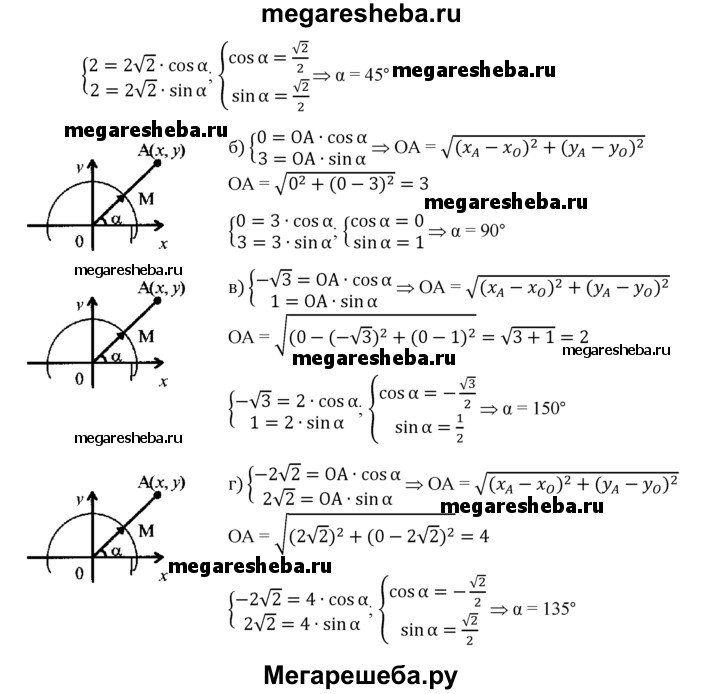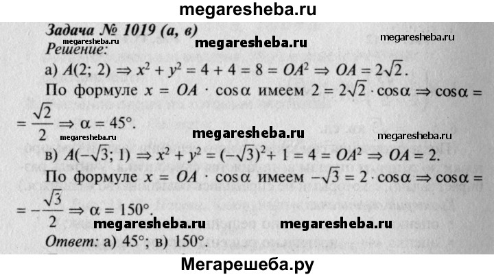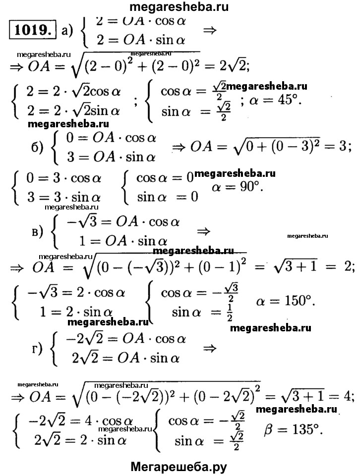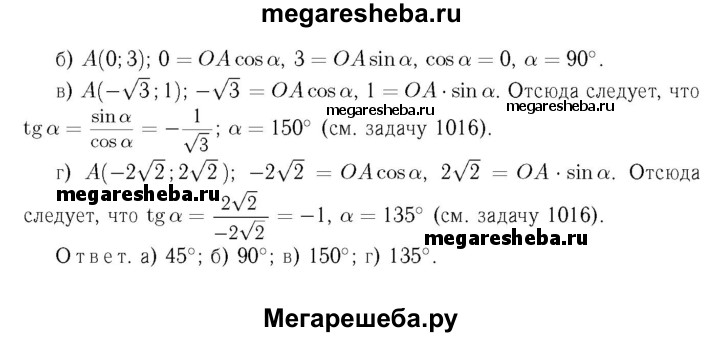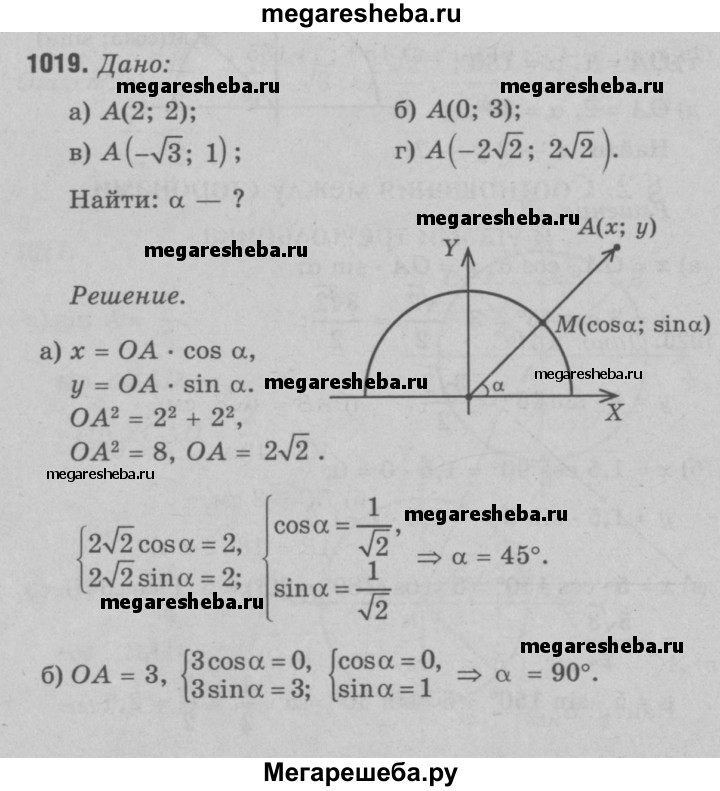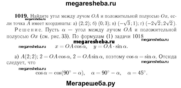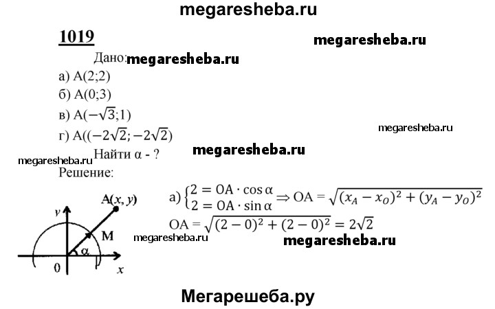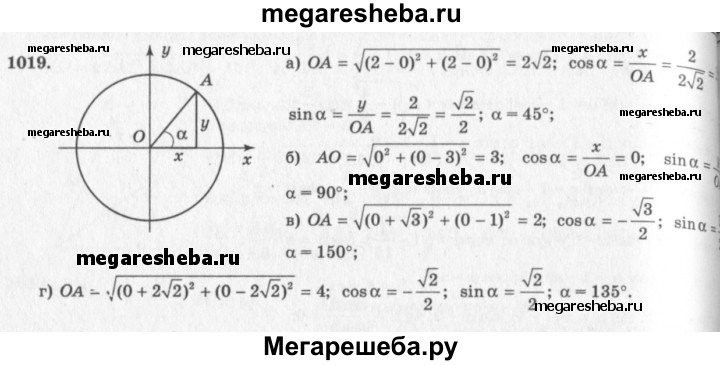 1019 Найдите угол между лучом OA и положительной полуосью Ох, если точка А имеет координаты: а) (2; 2); б) (0; 3); в) (-V3;l); г) (-2^2; 2^2).