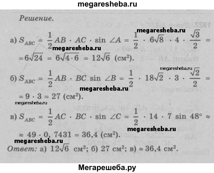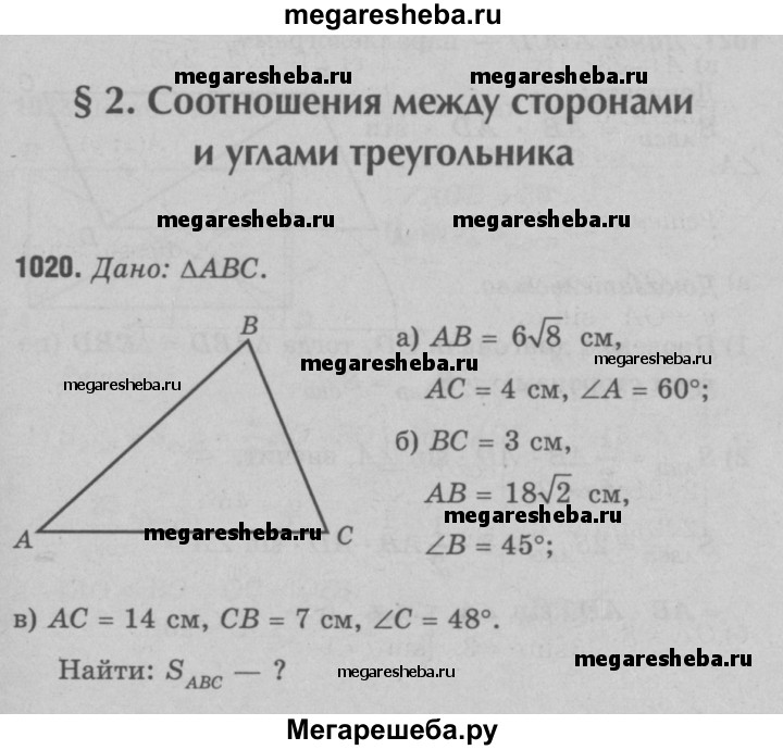 1020 Найдите площадь треугольника ABC, если: а) АВ = 6√8 см, АС = 4 см, ∠A = 60°; б) ВС = 3см, АВ = 18√2см, ∠B = 45°; в) АС = 14 см, СВ = 7 см, ∠C = 48°.