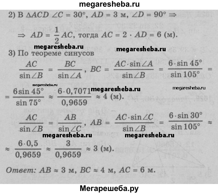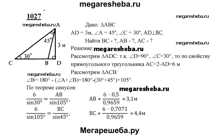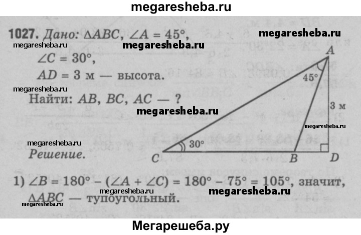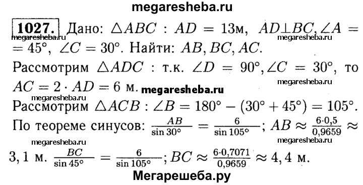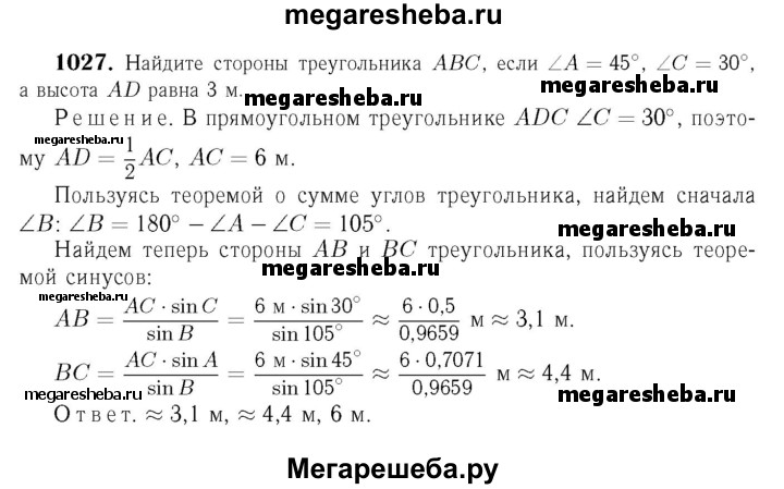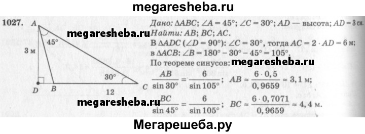 1027 Найдите стороны треугольника ABC если ∠A = 45°,∠C= 30° а высота AD равна 3 м.