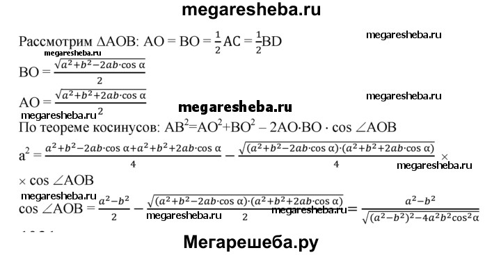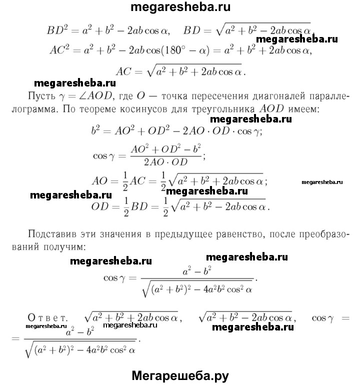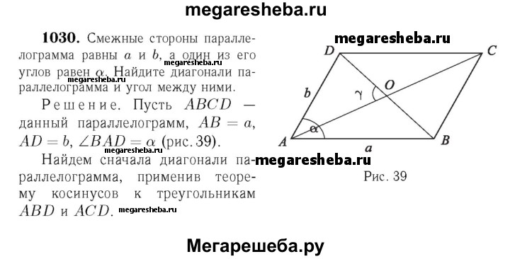 1030 Смежные стороны параллелограмма равны а и b, а один из его углов равен а. Найдите диагонали параллелограмма и угол между ними.