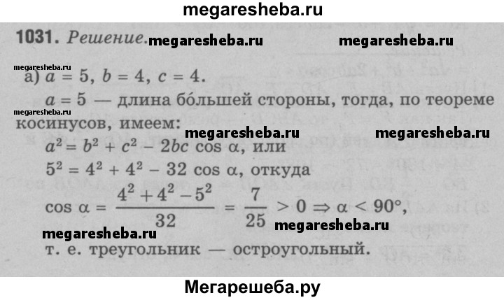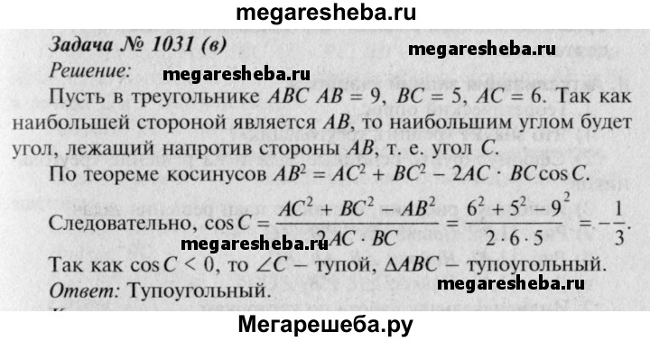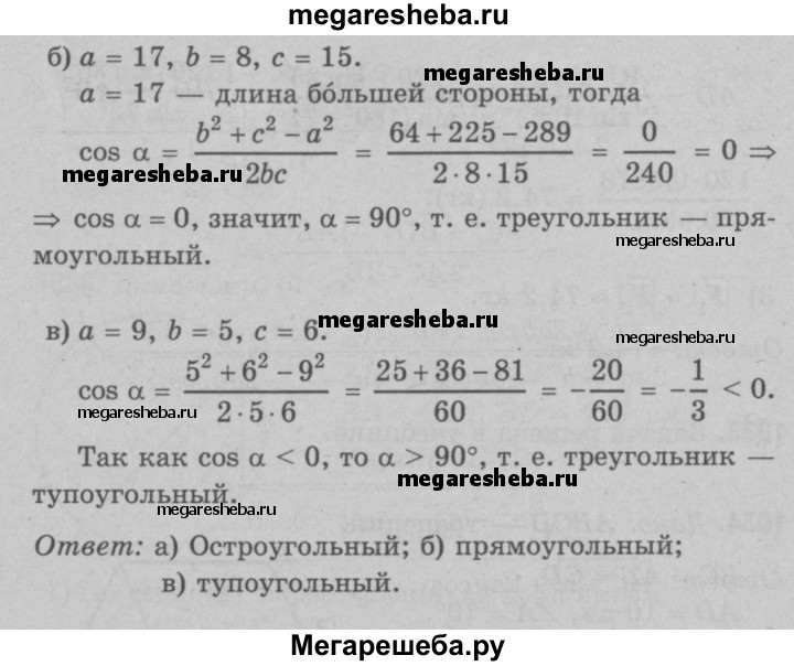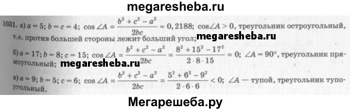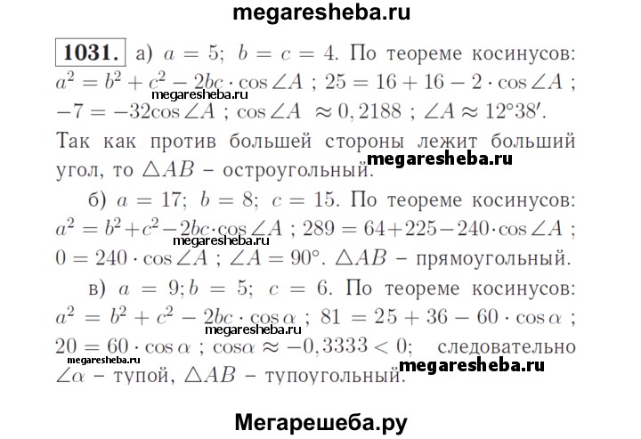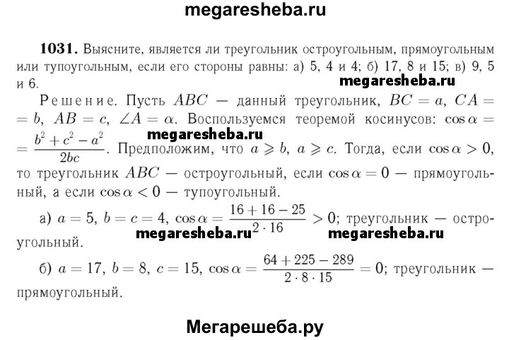 1031 Выясните, является ли треугольник остроугольным, прямоугольным или тупоугольным, если его стороны равны: а) 5, 4 и 4; б) 17, 8 и 15; в) 9, 5 и 6.