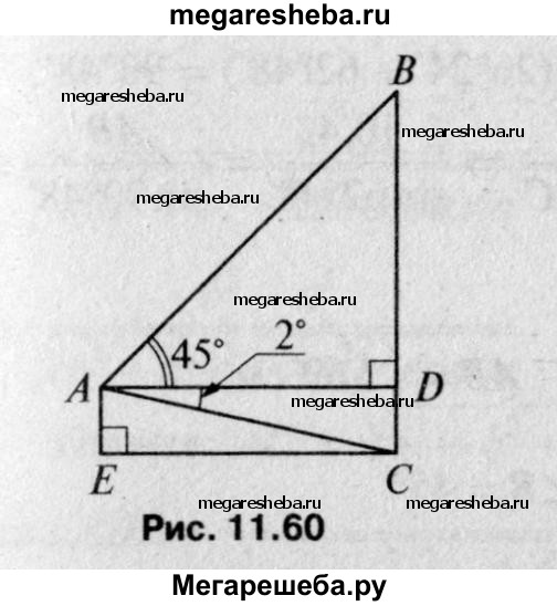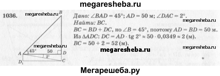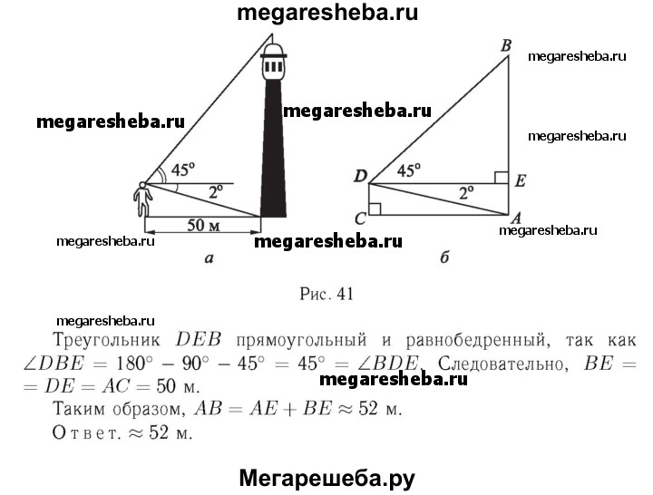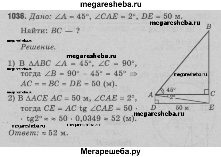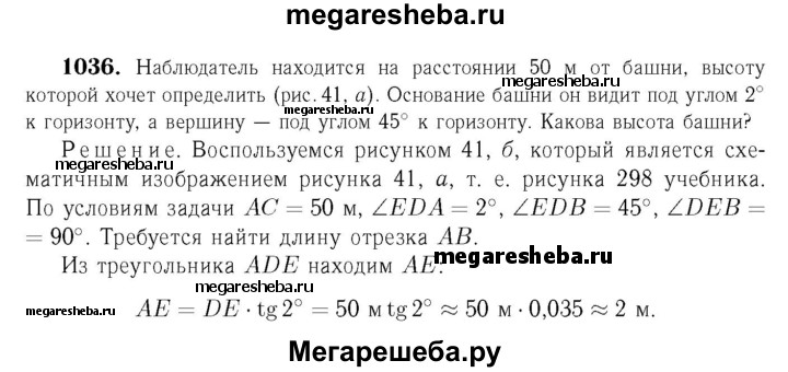1036 Наблюдатель находится на расстоянии 50 м от башни, высоту которой хочет определить (рис. 298). Основание башни он видит под углом 2° к горизонту, а вершину — под углом 45° к горизонту. Какова высота башни?