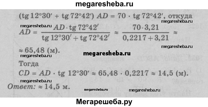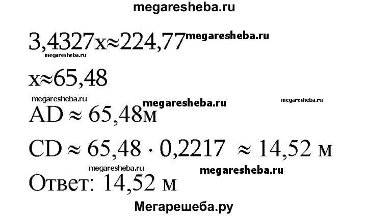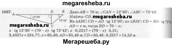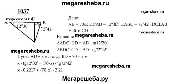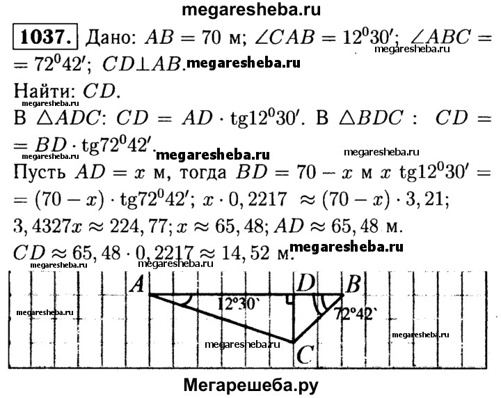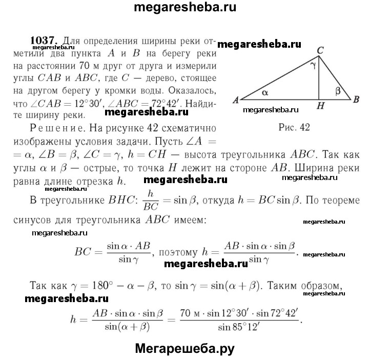 1037 Для определения ширины реки отметили два пункта А и В на берегу реки на расстоянии 70 м друг от друга и измерили углы CAB и ABC, где С — дерево, стоящее на другом берегу у кромки воды. Оказалось, что ∠CAB = 12°30', ∠AEC = 72°42'. Найдите ширину реки.