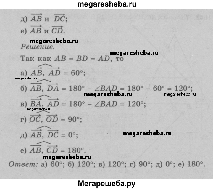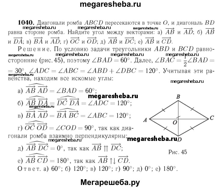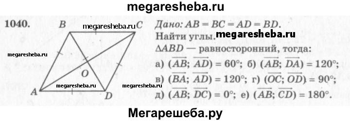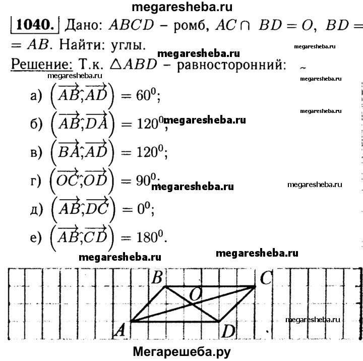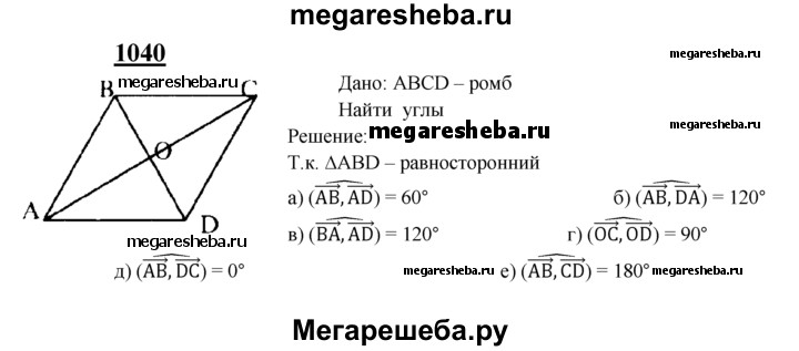 1040 Диагонали ромба ABCD пересекаются в точке О, и диагональ BD равна стороне ромба. Найдите угол между векторами: а) АВ и AD; б) АВ и DA; в) ВА и AD; г) ОС и OD; д) АВ и DA; е) АВ и CD.