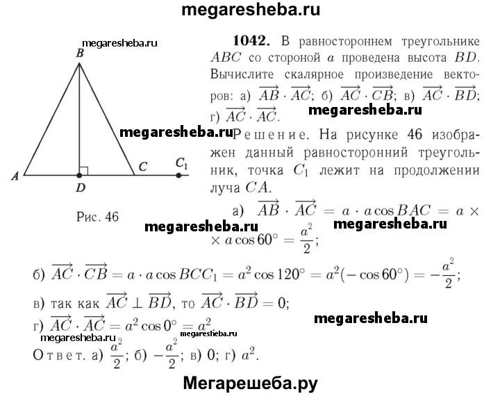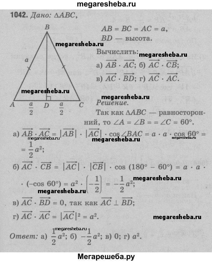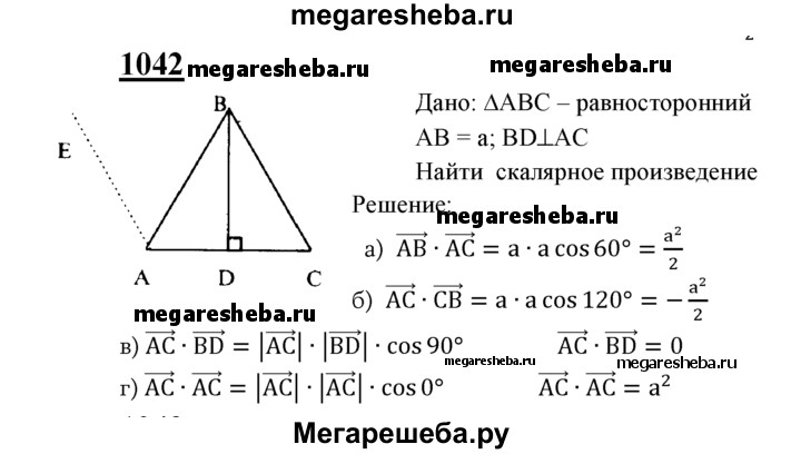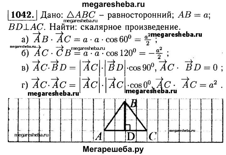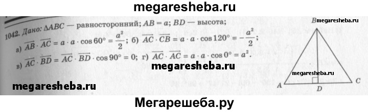 1042 В равностороннем треугольнике ABC со стороной а проведена высота BD. Вычислите скалярное произведение векторов: а) АВ • АС; б) АС - СВ; в) АС • BD; г) АС • АС.