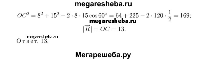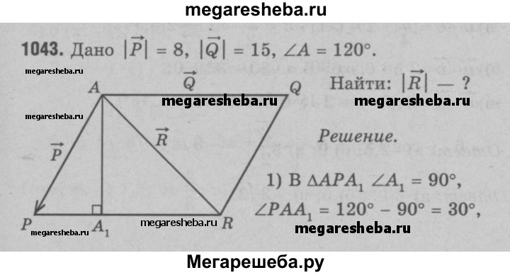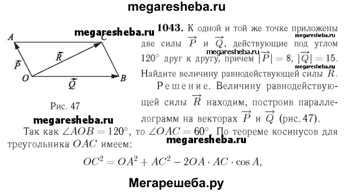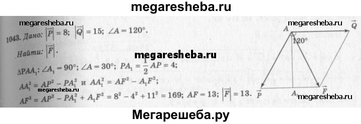 1043 К одной и той же точке приложены две силы Р и Q, действующие под углом 120° друг к другу, причём |Р| = 8, |Q| = 15. Найдите величину равнодействующей силы R.