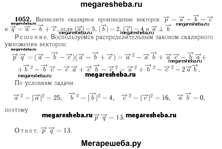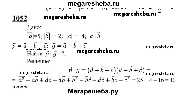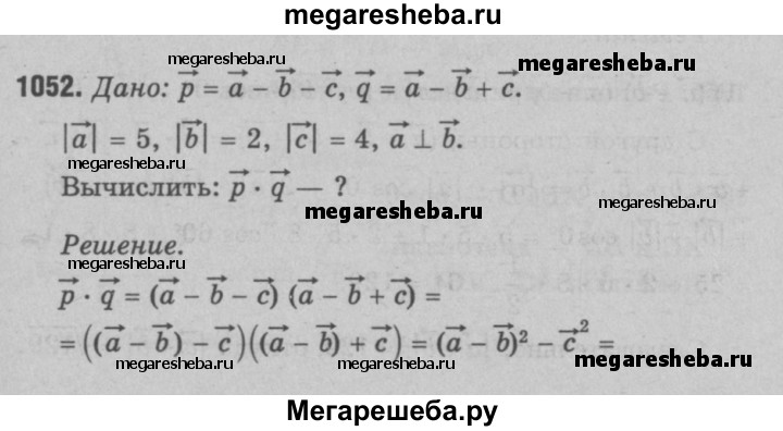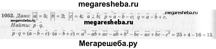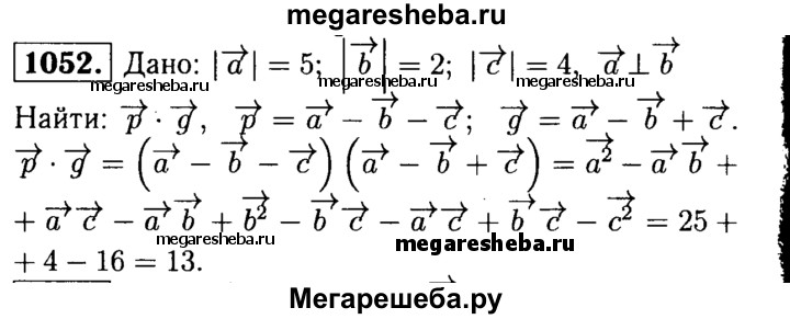 1052 й Вычислите скалярное произведение векторов р = а - b – с и q = а - b + с, если |а| = 5, |b| = 2, |с| = 4 и a ⊥ b.