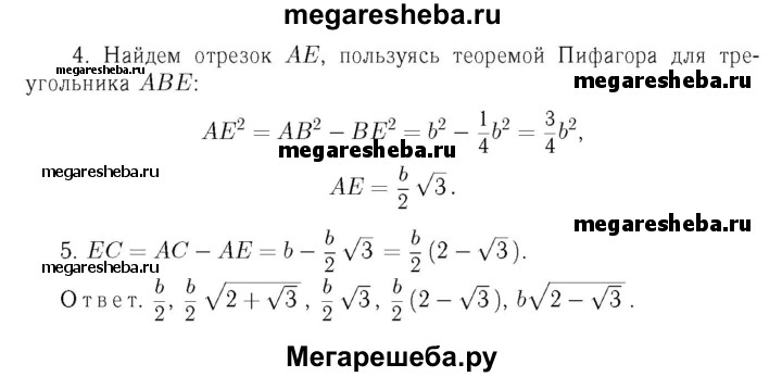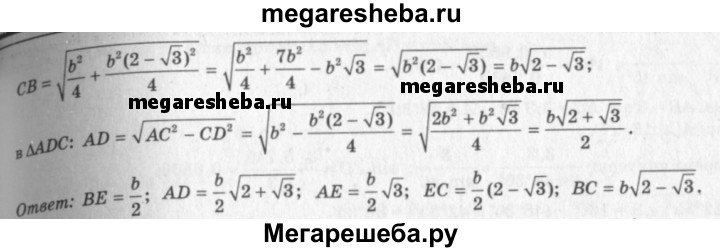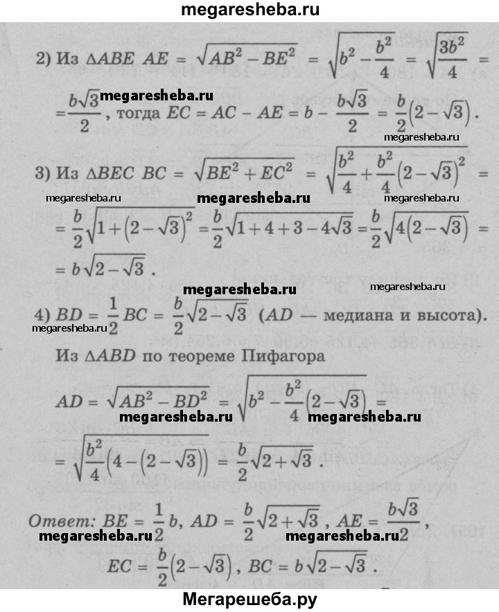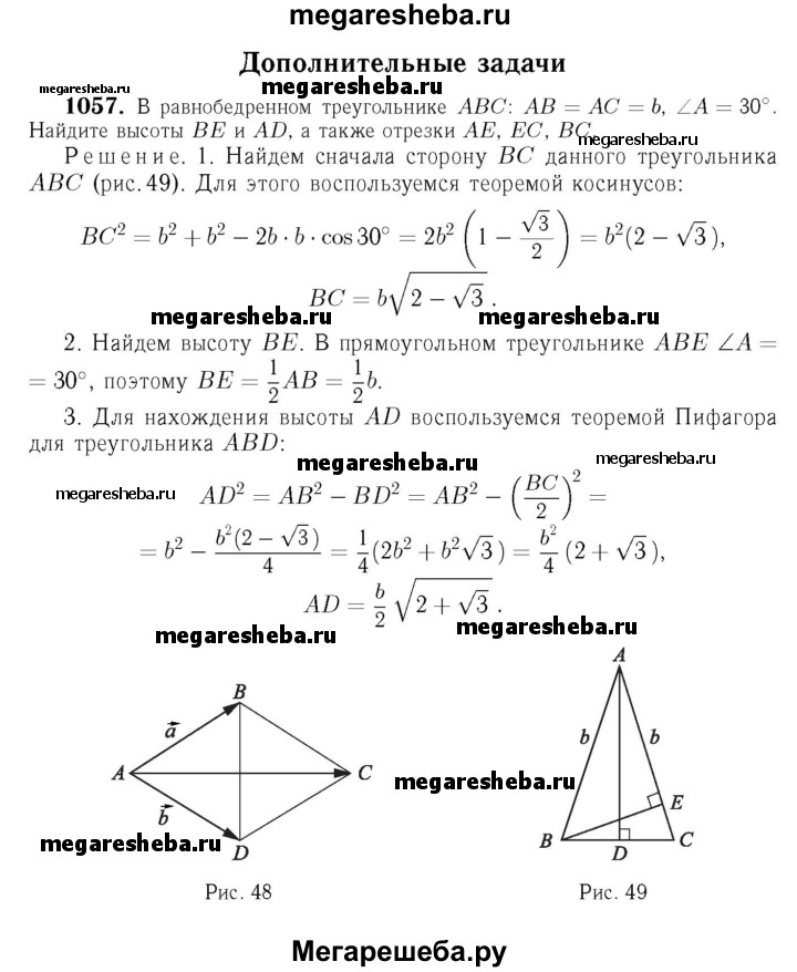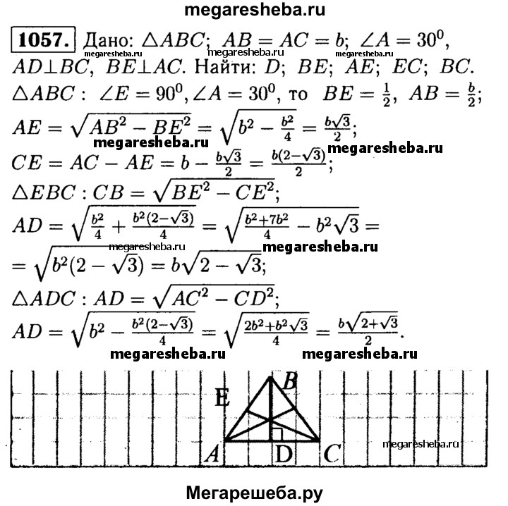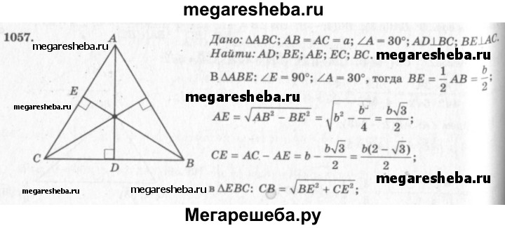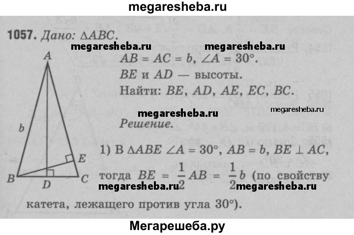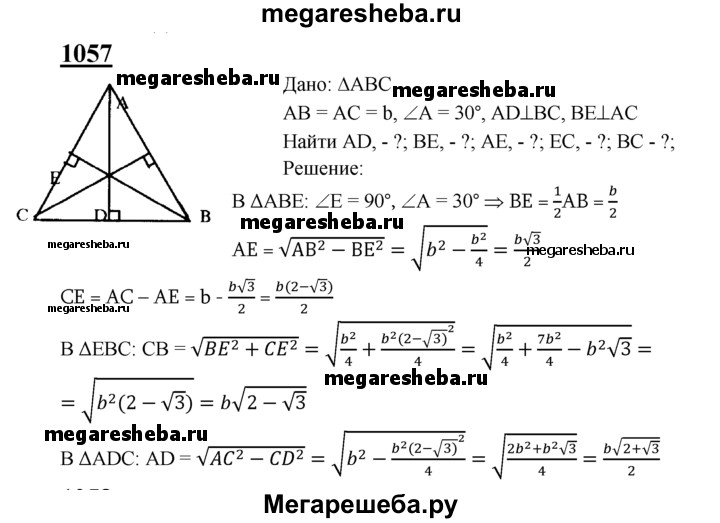 1057 В равнобедренном треугольнике ABC AB-AC-b, ∠A = 30°. Найдите высоты BE и AD, а также отрезки АЕ, ЕС, ВС.