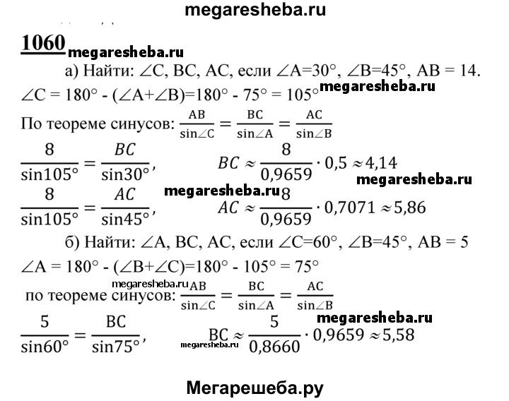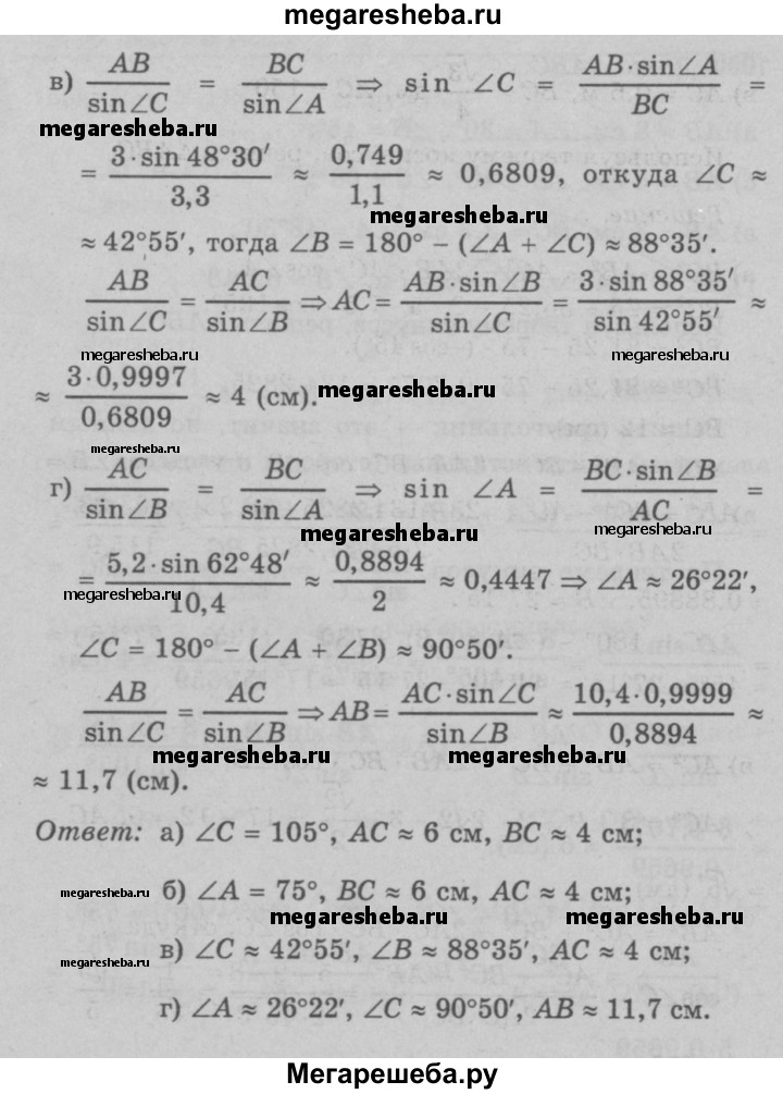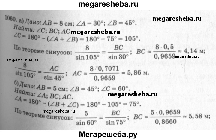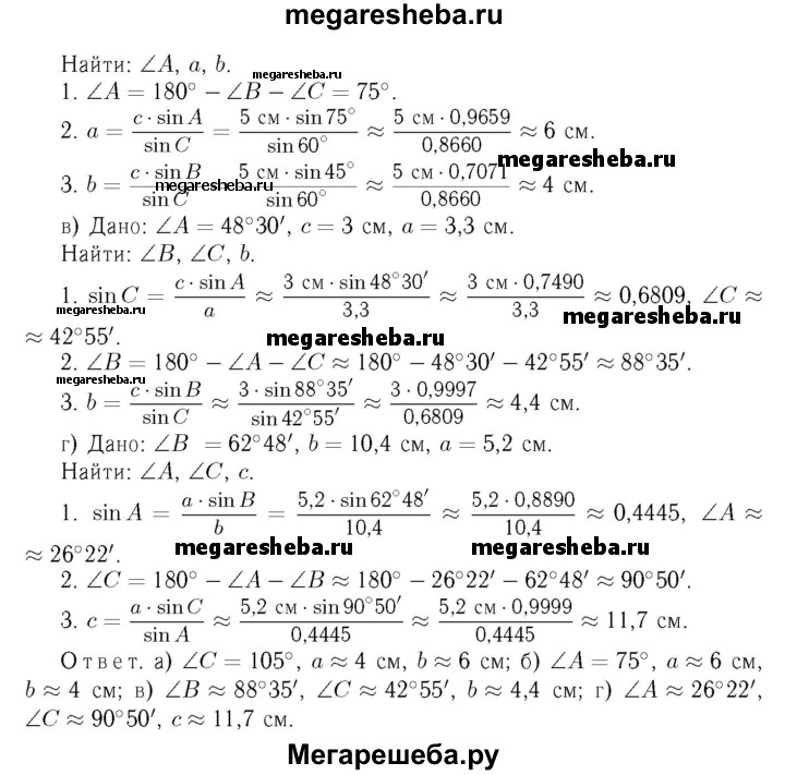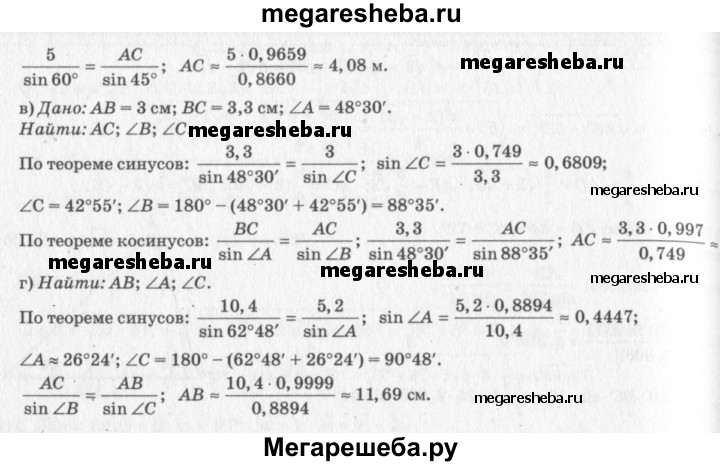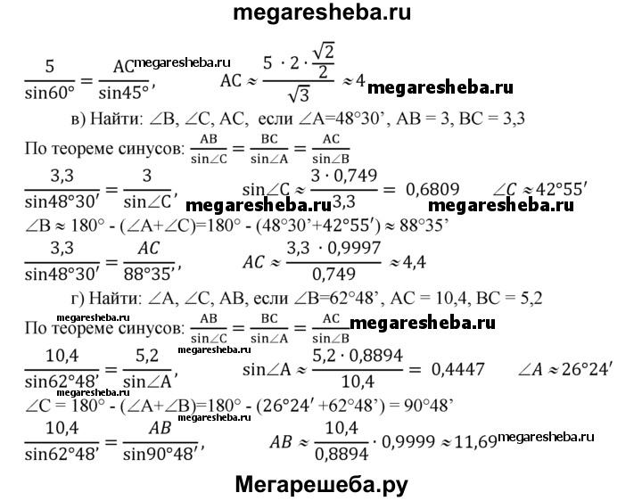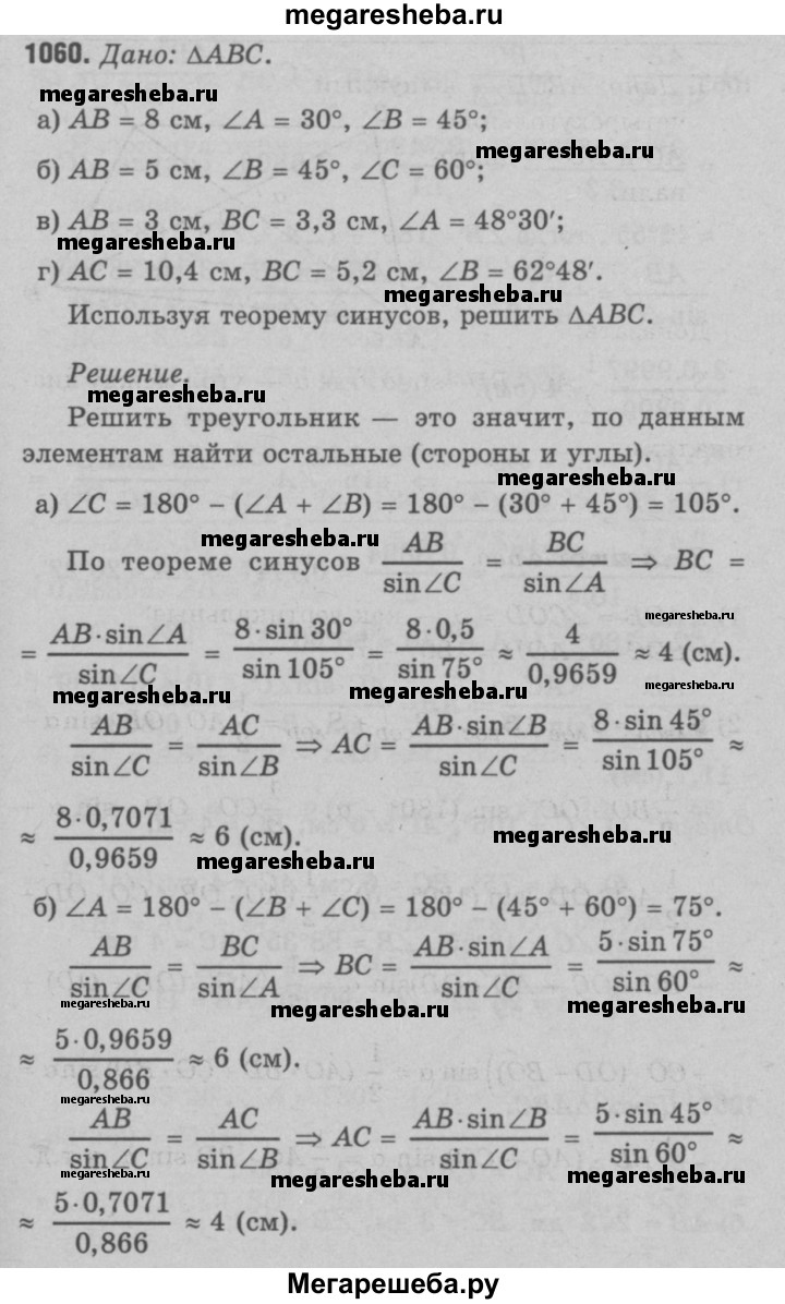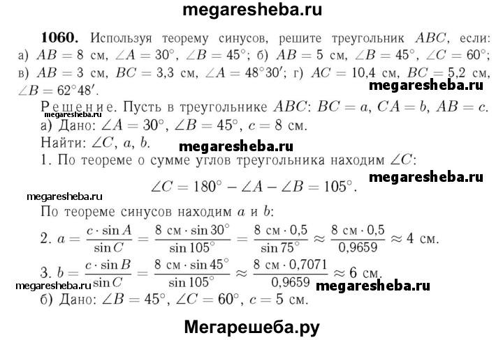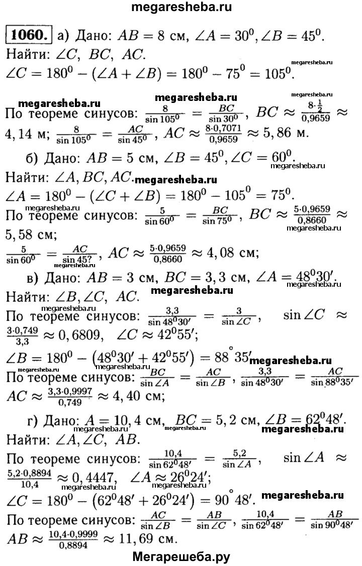 1060 Используя теорему синусов, решите треугольник ABC, если: а) АВ = 8 см, ∠A = 30°, ∠B = 45°; б) АВ = 5 см, ∠B = 45°, ∠C = 60°; в) АВ = 3см, ВС — 3,3 см, ∠A = 48°30'; г) АС = 10,4 см, ВС = 5,2 см, ∠B = 62°48'.