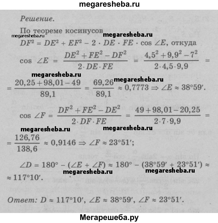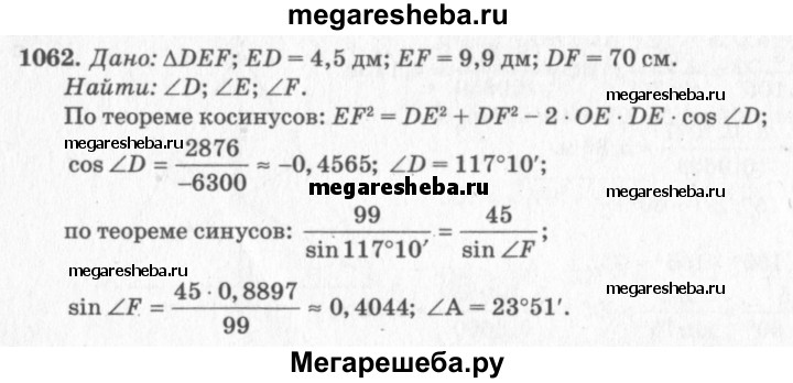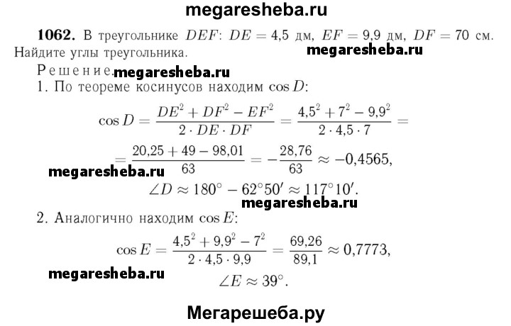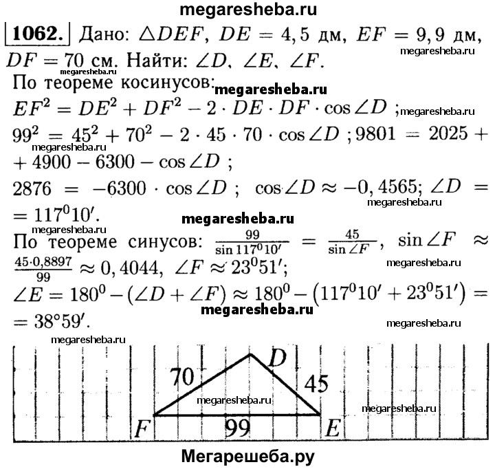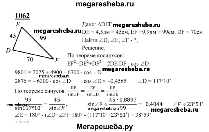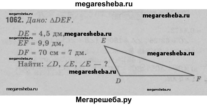 1062 В треугольнике DEF DE = 4,5 дм, EF = 9,9 дм, DF=70cm. Найдите углы треугольника.