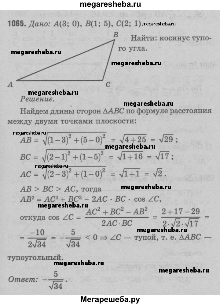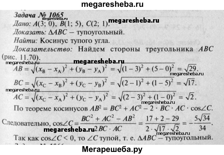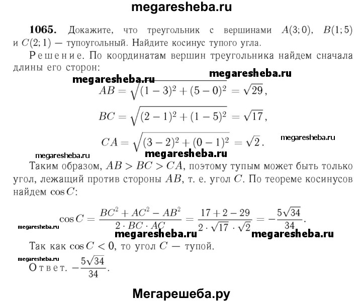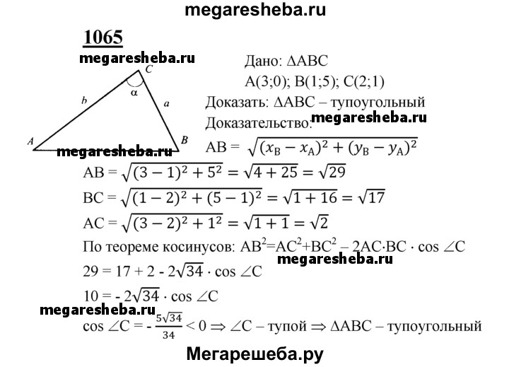 1065 Докажите, что треугольник с вершинами А (3; 0), В (1; 5) и С (2; 1) тупоугольный. Найдите косинус тупого угла.