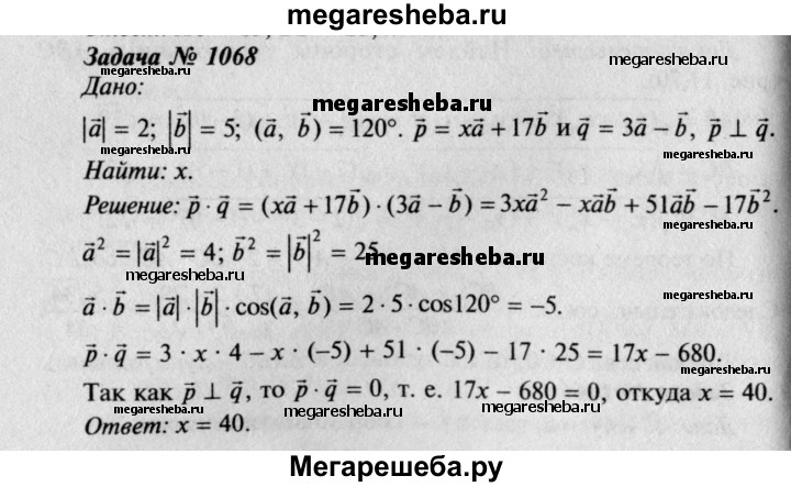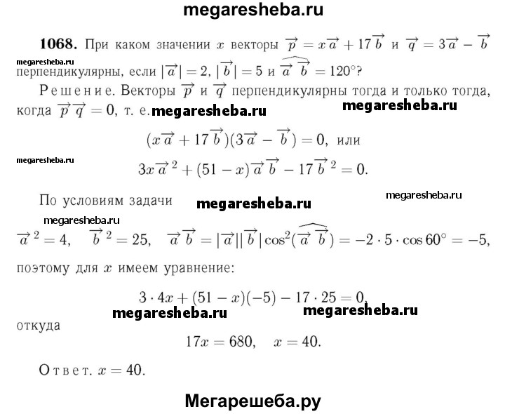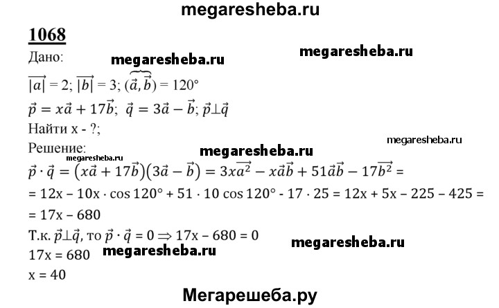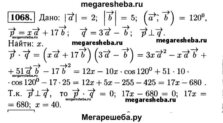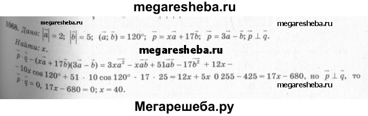 1068 При каком значении х векторы р = ха + 17b и q = 3a-b перпендикулярны, если |а| = 2, |b| = 5 и аb = 120°?