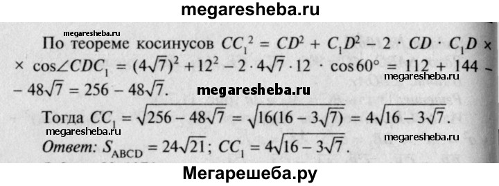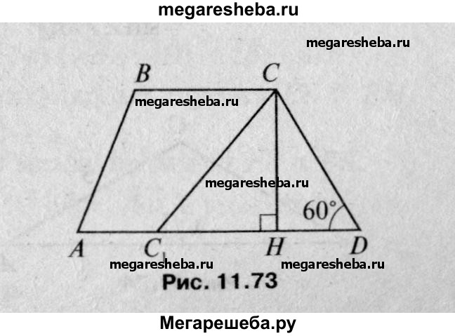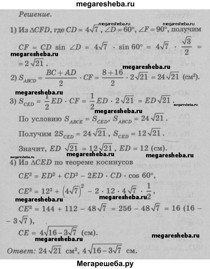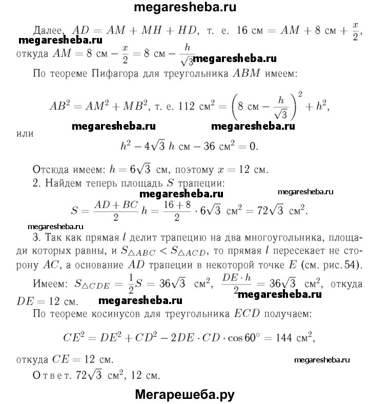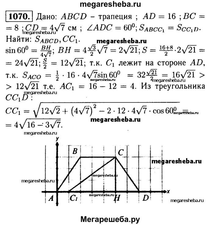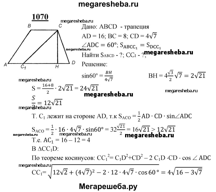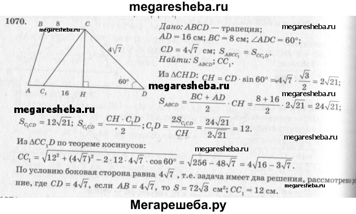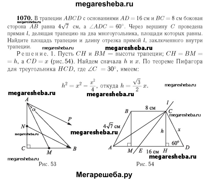 1070 В трапеции ABCD с основаниями AD= 16 см и ВС = 8 см боковая сторона равна 4√7см, a ∠ADC = 60°. Через вершину С проведена прямая I, делящая трапецию на два многоугольника, площади которых равны. Найдите площадь трапеции и длину отрезка прямой I, заключённого внутри трапеции.