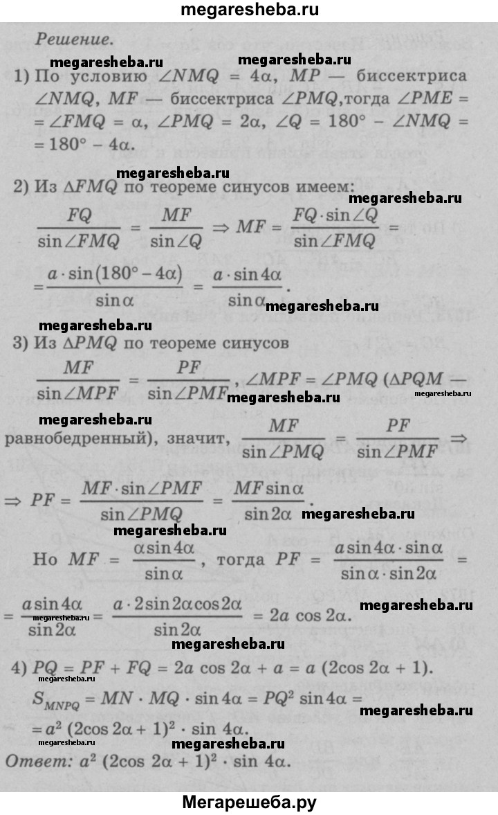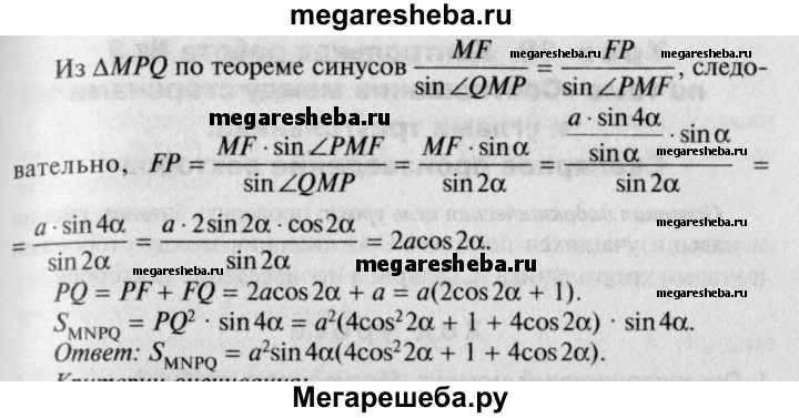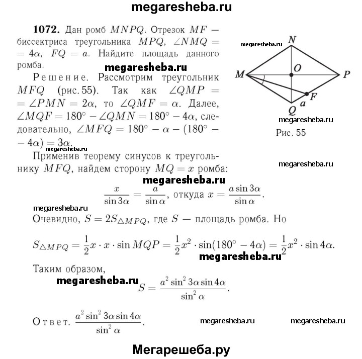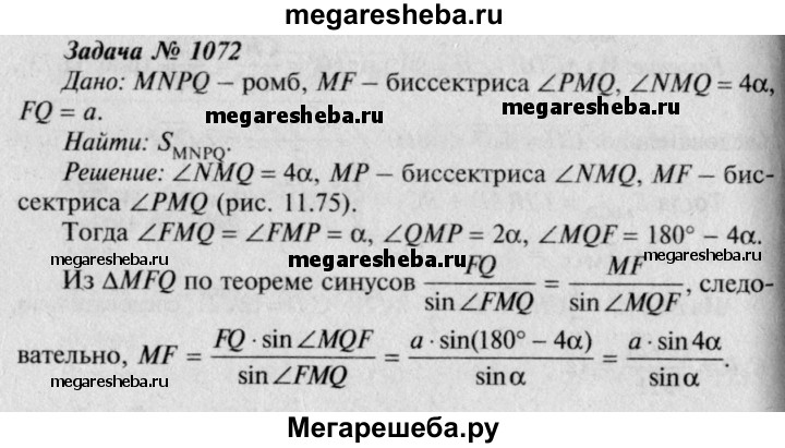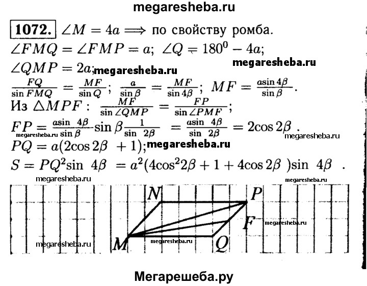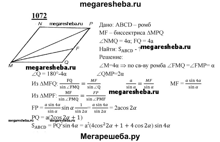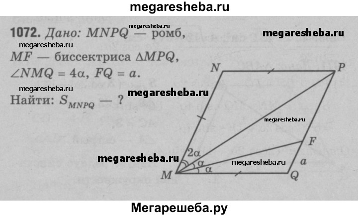 1072 Дан ромб MNPQ. Отрезок MF — биссектриса треугольника MPQ, ZNMQ = 4а, FQ = a. Найдите площадь данного ромба.