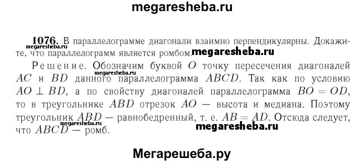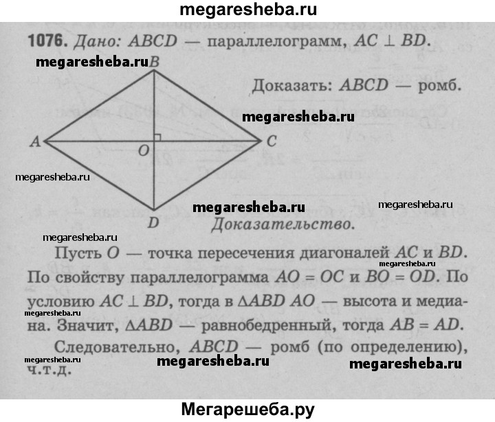 1076 Диагонали параллелограмма взаимно перпендикулярны. Докажите, что этот параллелограмм является ромбом