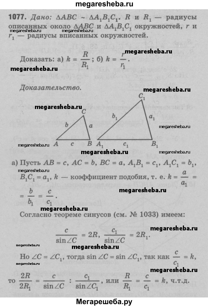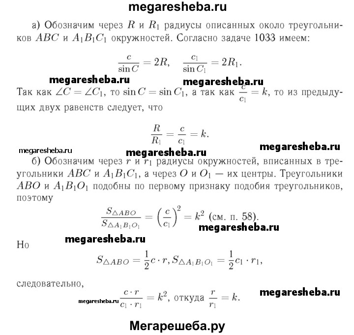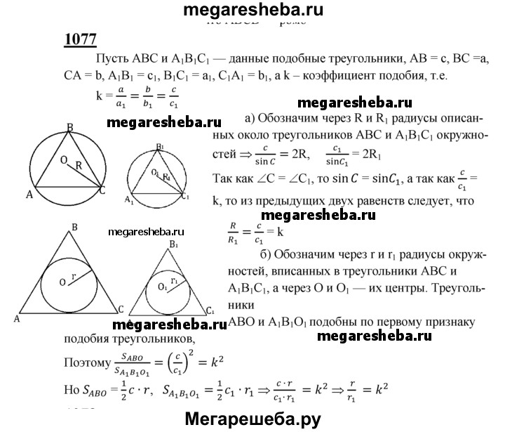1077 Докажите, что коэффициент подобия двух подобных треугольников равен отношению радиусов окружностей: а) описанных около треугольников; б) вписанных в эти треугольники.