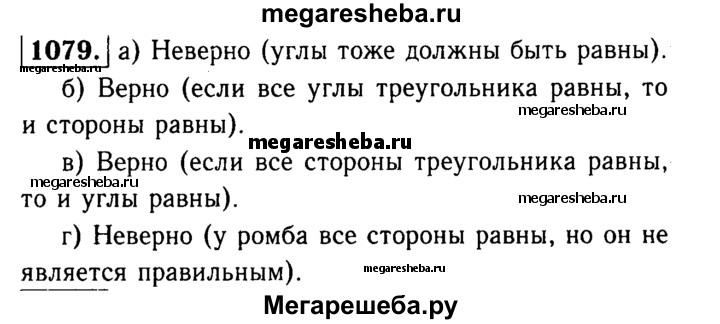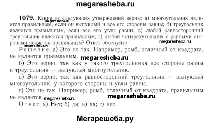1079 Какие из следующих утверждений верны: а) многоугольник является правильным, если он выпуклый и все его стороны равны; б) треугольник является правильным, если все его углы равны; в) любой равносторонний треугольник является правильным; г) любой четырёхугольник с равными сторонами является правильным? Ответ обоснуйте.