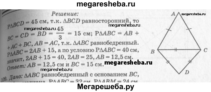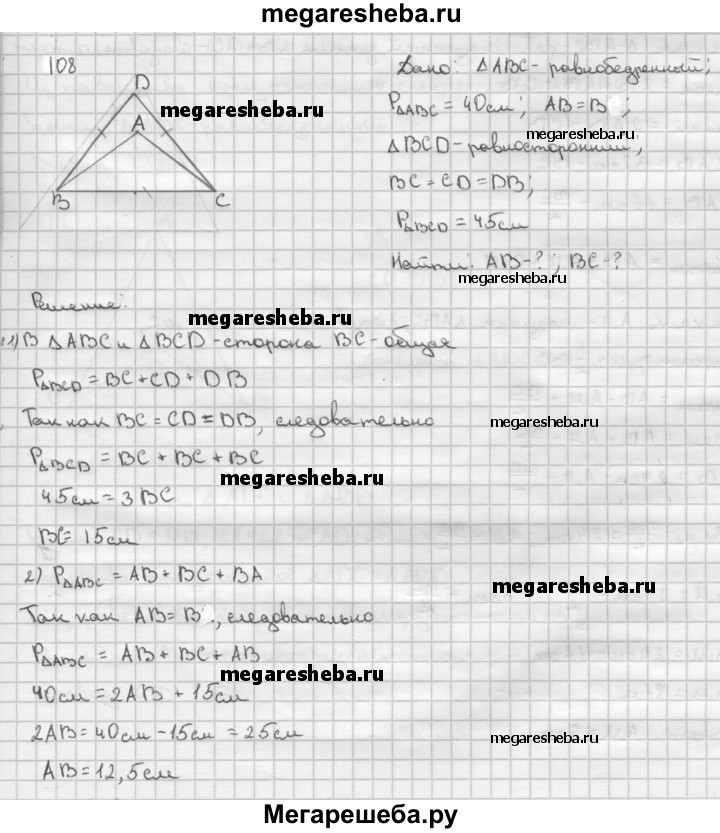 108 Периметр равнобедренного треугольника ABC с основанием ВС равен 40 см, а периметр равностороннего треугольника BCD равен 45 см. Найдите стороны АВ и ВС.