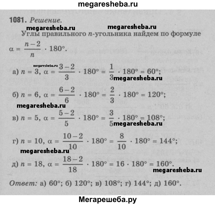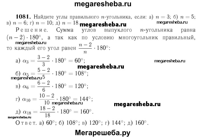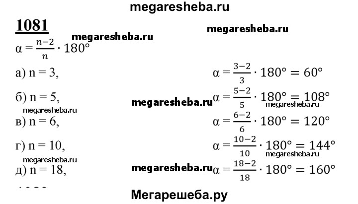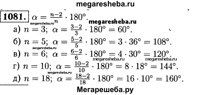 1081 Найдите углы правильного n-угольника, если: а) n = 3; б) n = 5; в) n = 6; г) n = 10; д) n = 18.