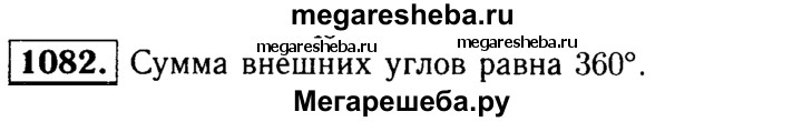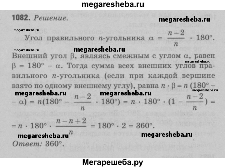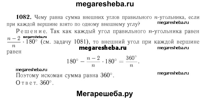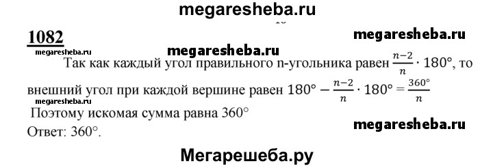 1082 Чему равна сумма внешних углов правильного га-угольника, если при каждой вершине взято по одному внешнему углу?