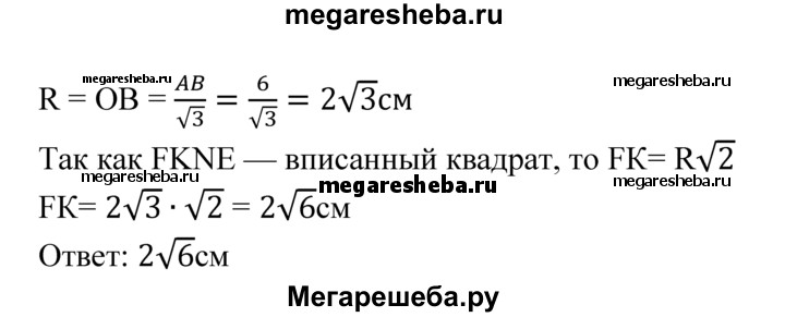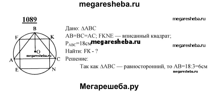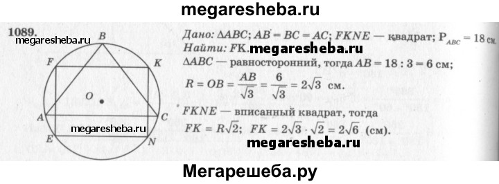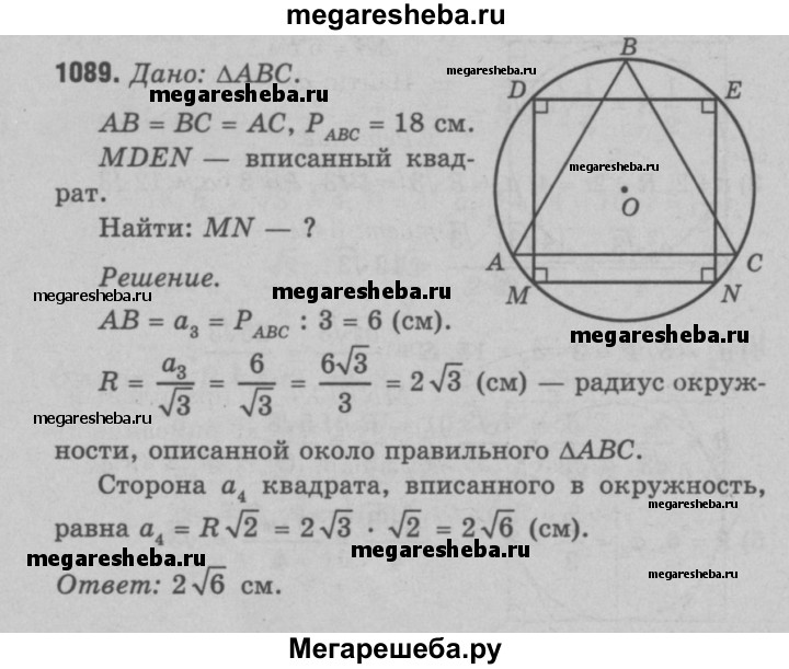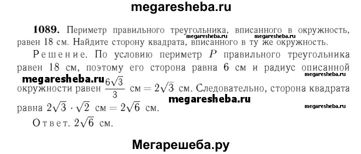 1089 Периметр правильного треугольника, вписанного в окружность, равен 18 см. Найдите сторону квадрата, вписанного в ту же окружность.