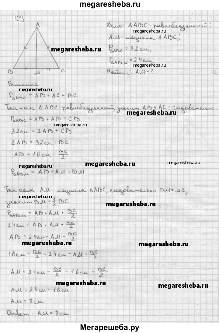109 В равнобедренном треугольнике ABC с основанием ВС проведена медиана AM. Найдите медиану AM, если периметр треугольника ABC равен 32 см, а периметр треугольника АВМ равен 24 см.