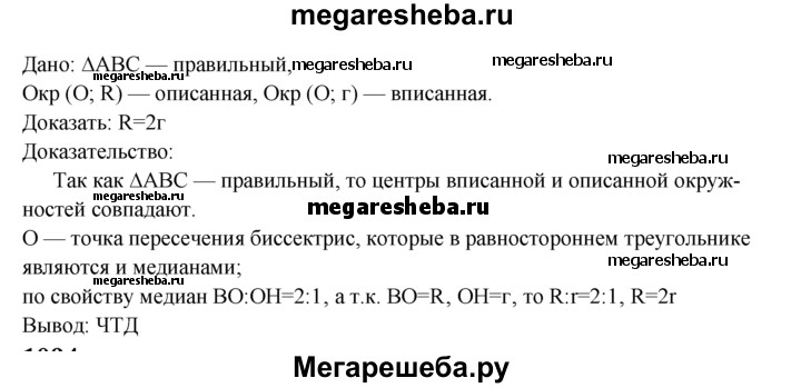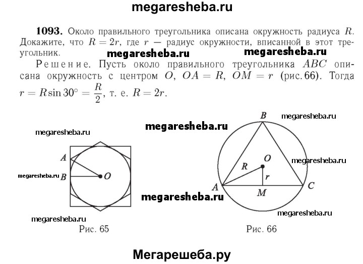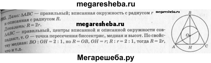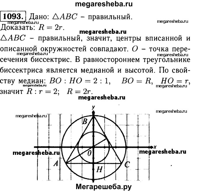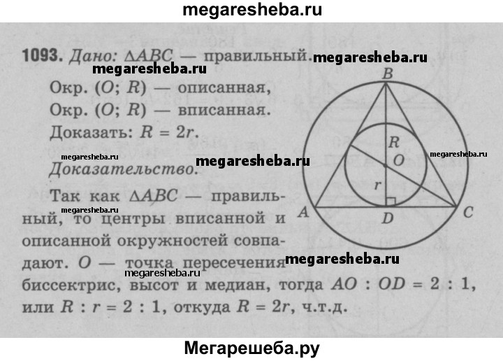 1093 Около правильного треугольника описана окружность радиуса R. Докажите, что R = 2r, где г — радиус окружности, вписанной в этот треугольник.