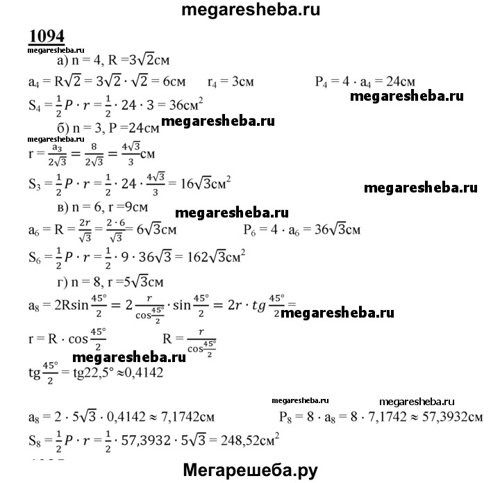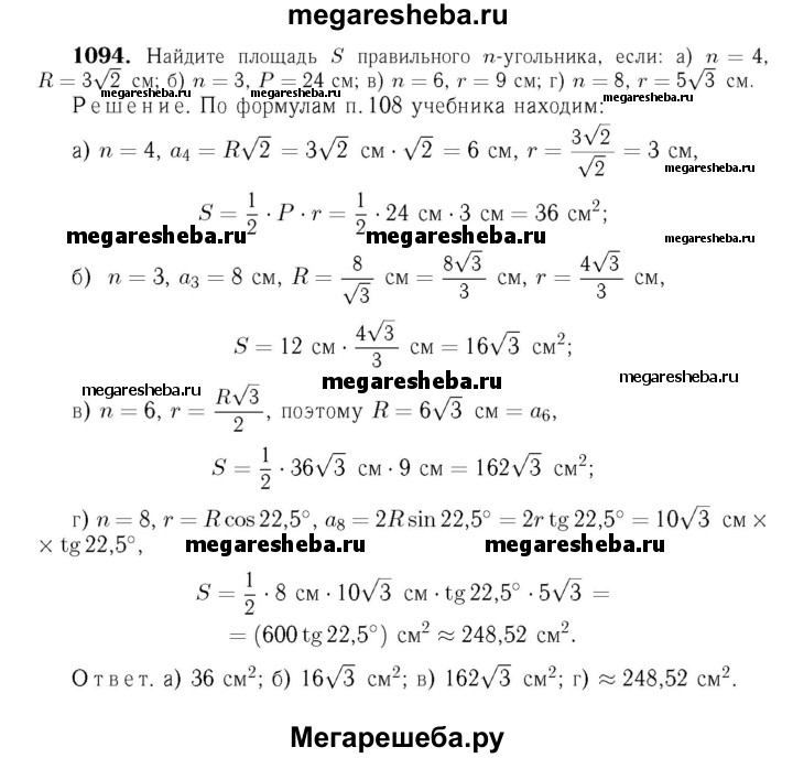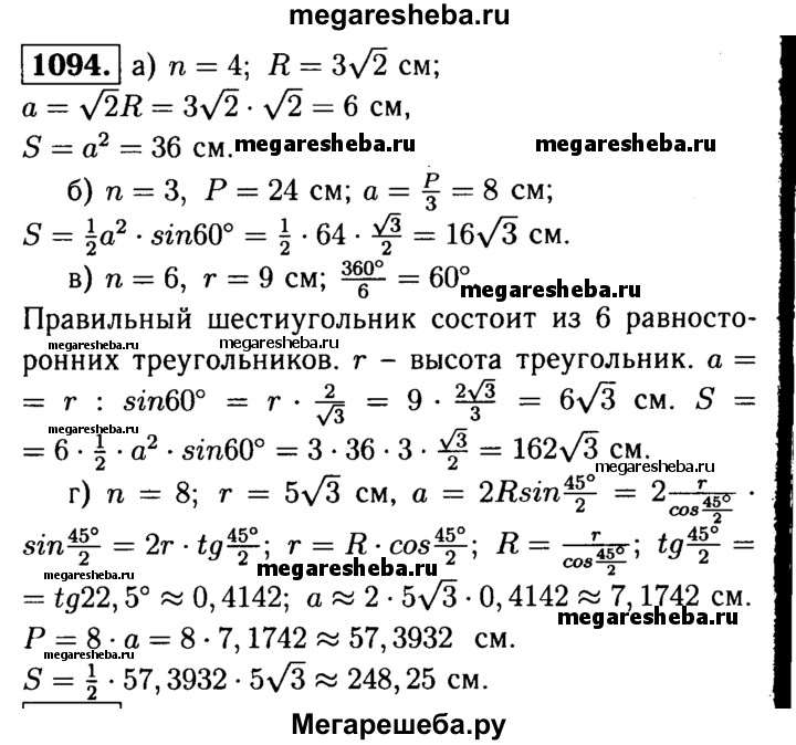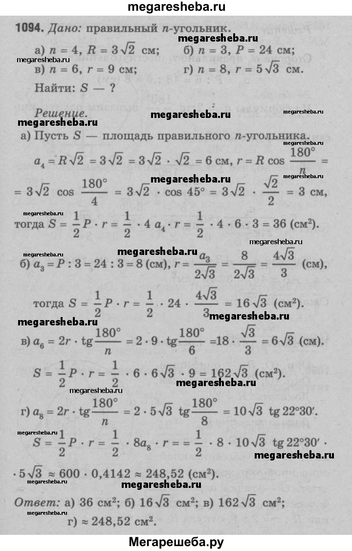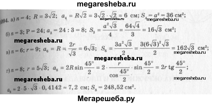 1094 Найдите площадь S правильного /г-угольника, если: а) n = 4, R = 3√2 см; б) n = 3, Р = 24 см; в) n = 6, r=9см; г) n = 8, r = 5√3 см.