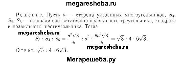 1096 Стороны правильного треугольника, квадрата и правильного шестиугольника равны друг другу. Найдите отношения площадей этих многоугольников.