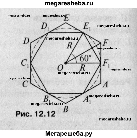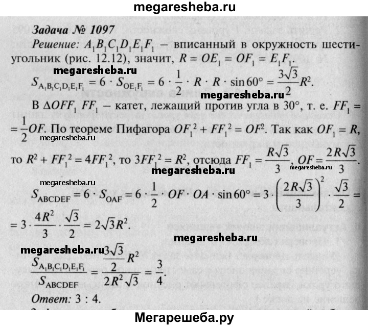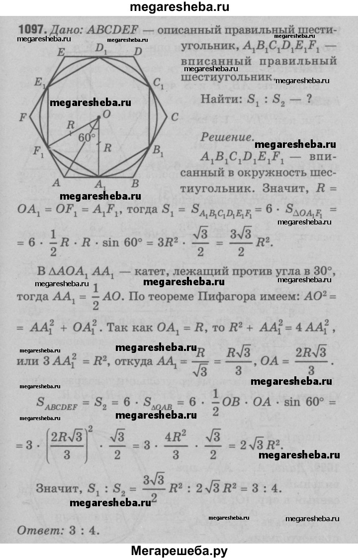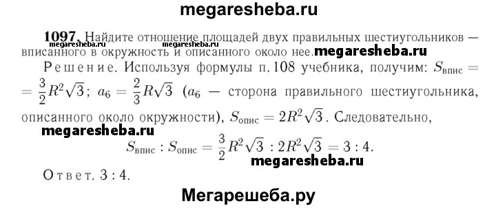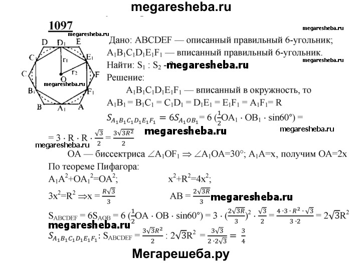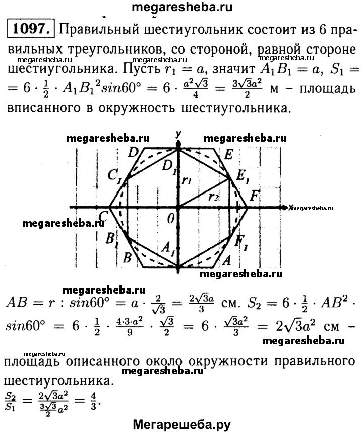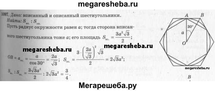 1097 Найдите отношение площадей двух правильных шестиугольников — вписанного в окружность и описанного около неё.