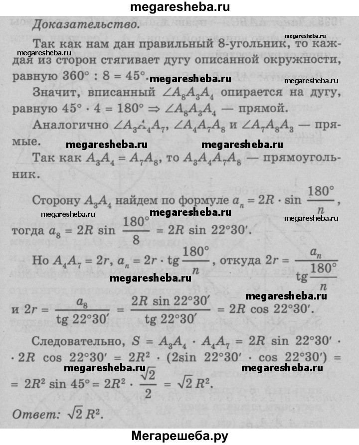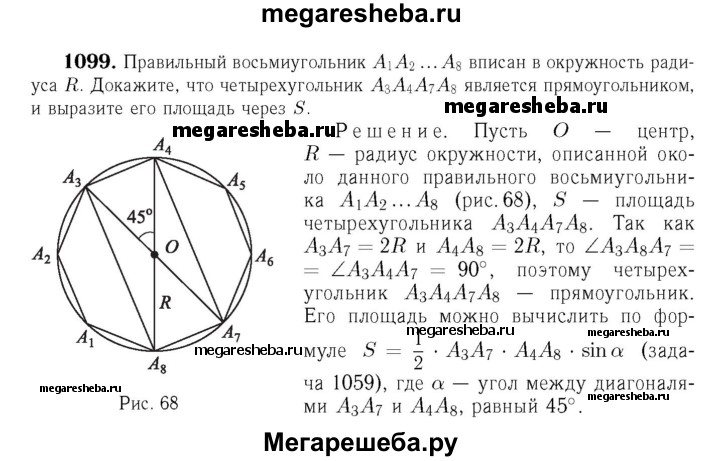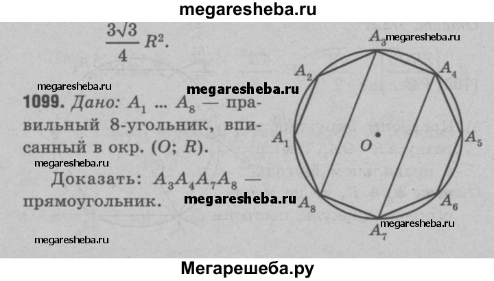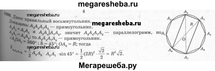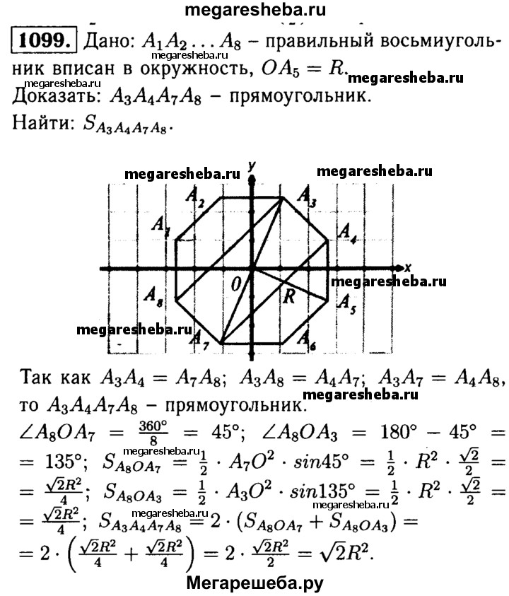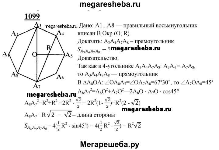1099 Правильный восьмиугольник A1A2...A8 вписан в окружность радиуса R. Докажите, что четырехугольник A3A4A7A8 является прямоугольником, и выразите его площадь через R.