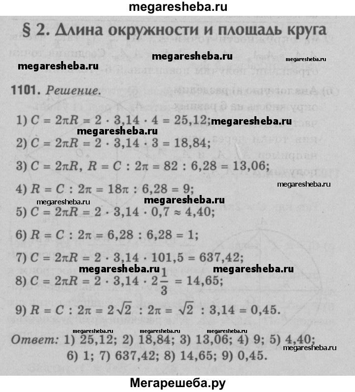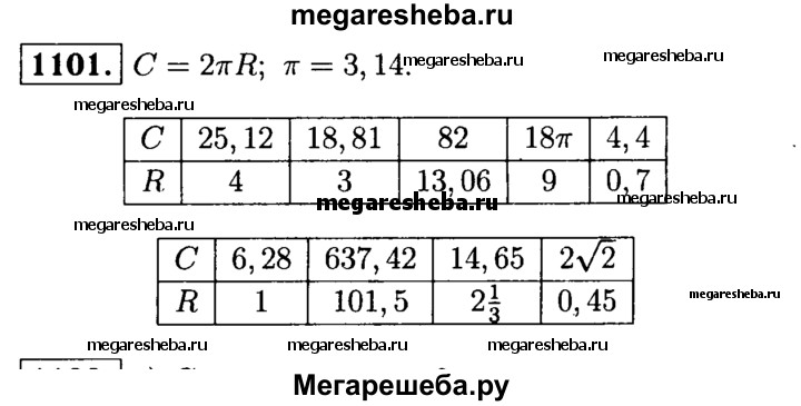 1101 У Перечертите таблицу и, используя формулу длины С окружности радиуса r, заполните пустые клетки таблицы. Воспользуйтесь значением π = 3,14. С 82 18π 6,28 2√2 R 4 3 0,7 101,5 ½